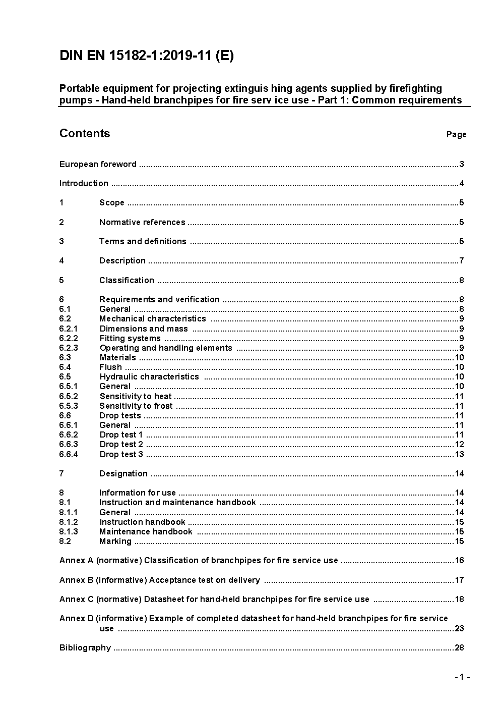 Portable equipment for projecting extinguishing agents supplied by firefighting pumps - Hand-held branchpipes for fire service use - Part 1: Common requirements; German and English version prEN 15182-1:2018