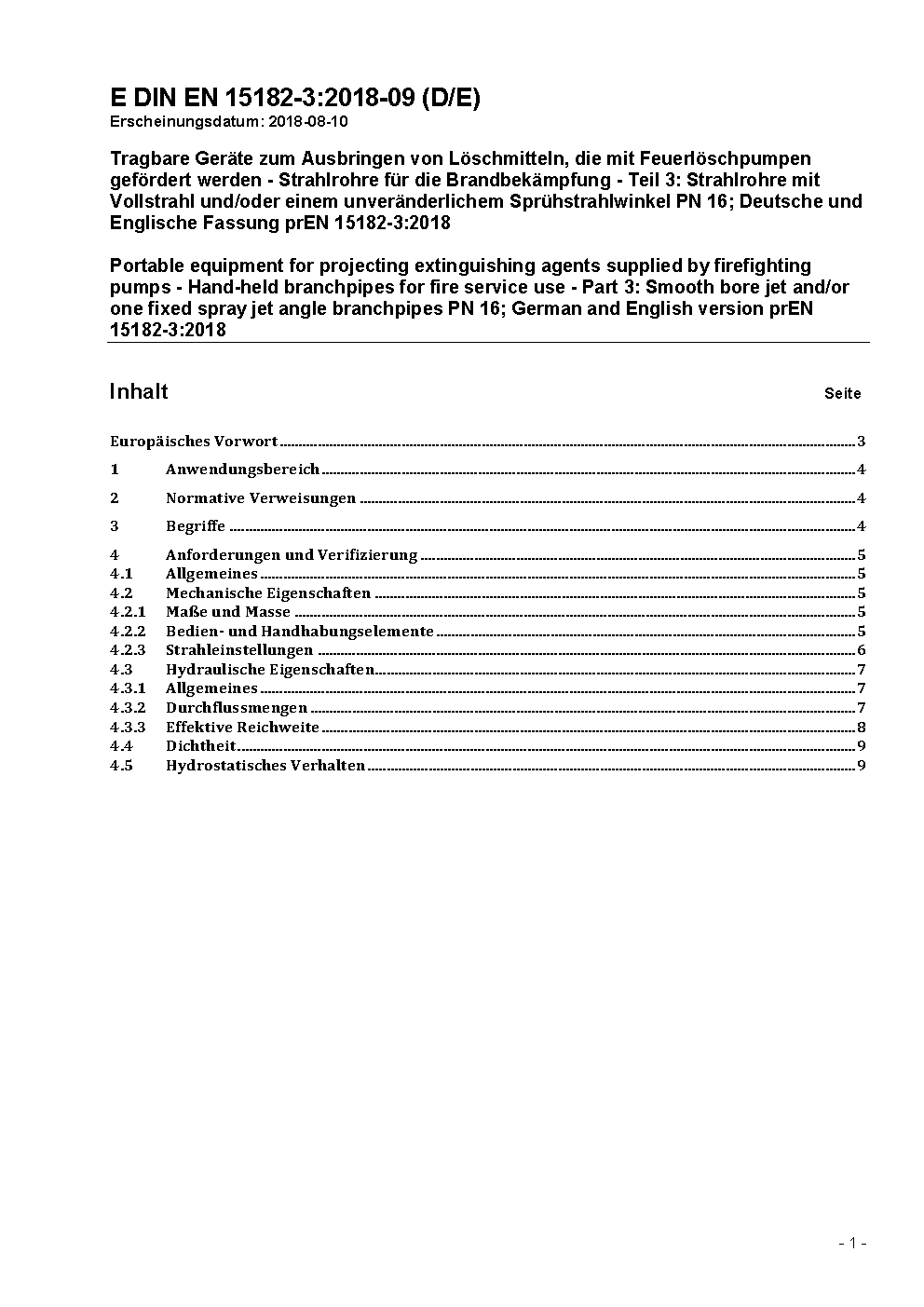 Tragbare Geräte zum Ausbringen von Löschmitteln, die mit Feuerlöschpumpen gefördert werden - Strahlrohre für die Brandbekämpfung - Teil 3: Strahlrohre mit Vollstrahl und/oder einem unveränderlichem Sprühstrahlwinkel PN 16; Deutsche und Englische Fassung prEN 15182-3:2018