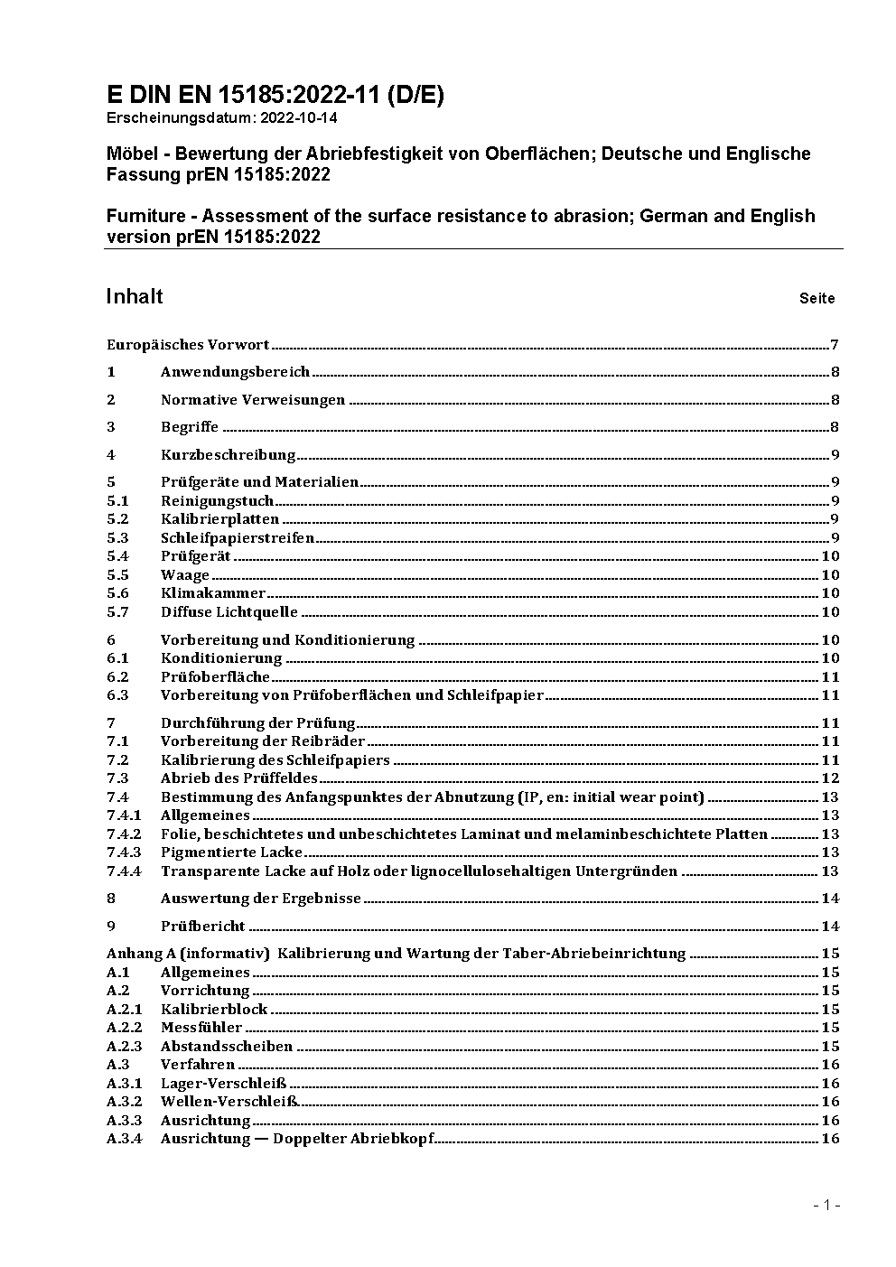 Möbel - Bewertung der Abriebfestigkeit von Oberflächen; Deutsche Fassung EN 15185:2011
