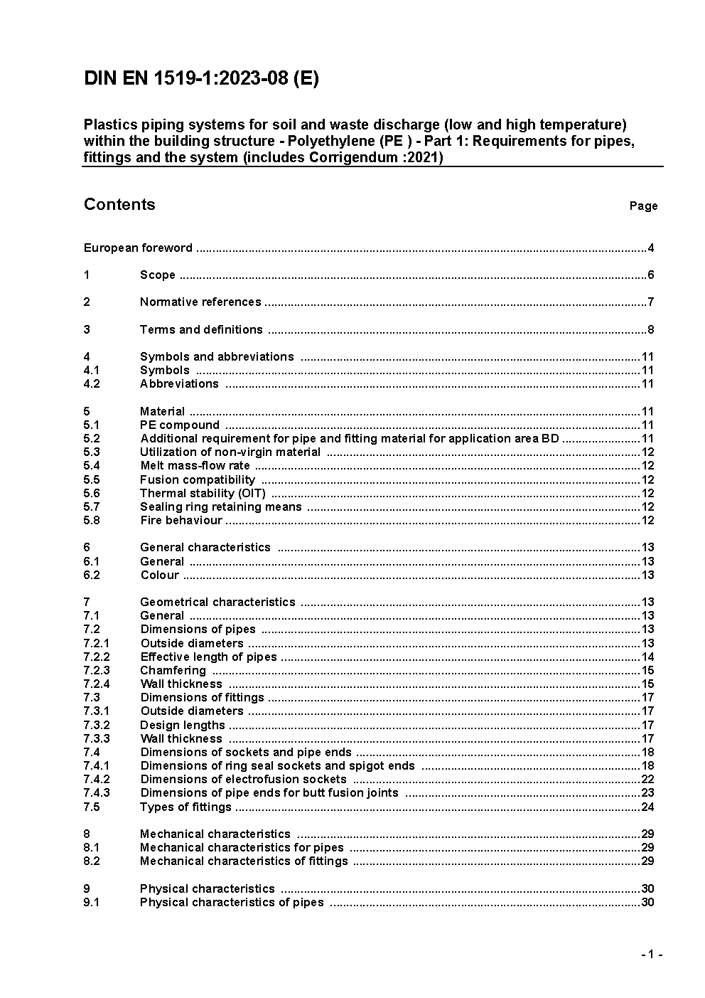 Kunststoff-Rohrleitungssysteme zum Ableiten von Abwasser (niedriger und hoher Temperatur) innerhalb der Gebäudestruktur - Polyethylen (PE) - Teil 1: Anforderungen an Rohre, Formstücke und das Rohrleitungssystem; Deutsche Fassung EN 1519-1:1999 / Achtung: Daneben gelten DIN 19535-1 (1988-03) und DIN 19535-2 (1987-04) noch bis 2001-07-31.