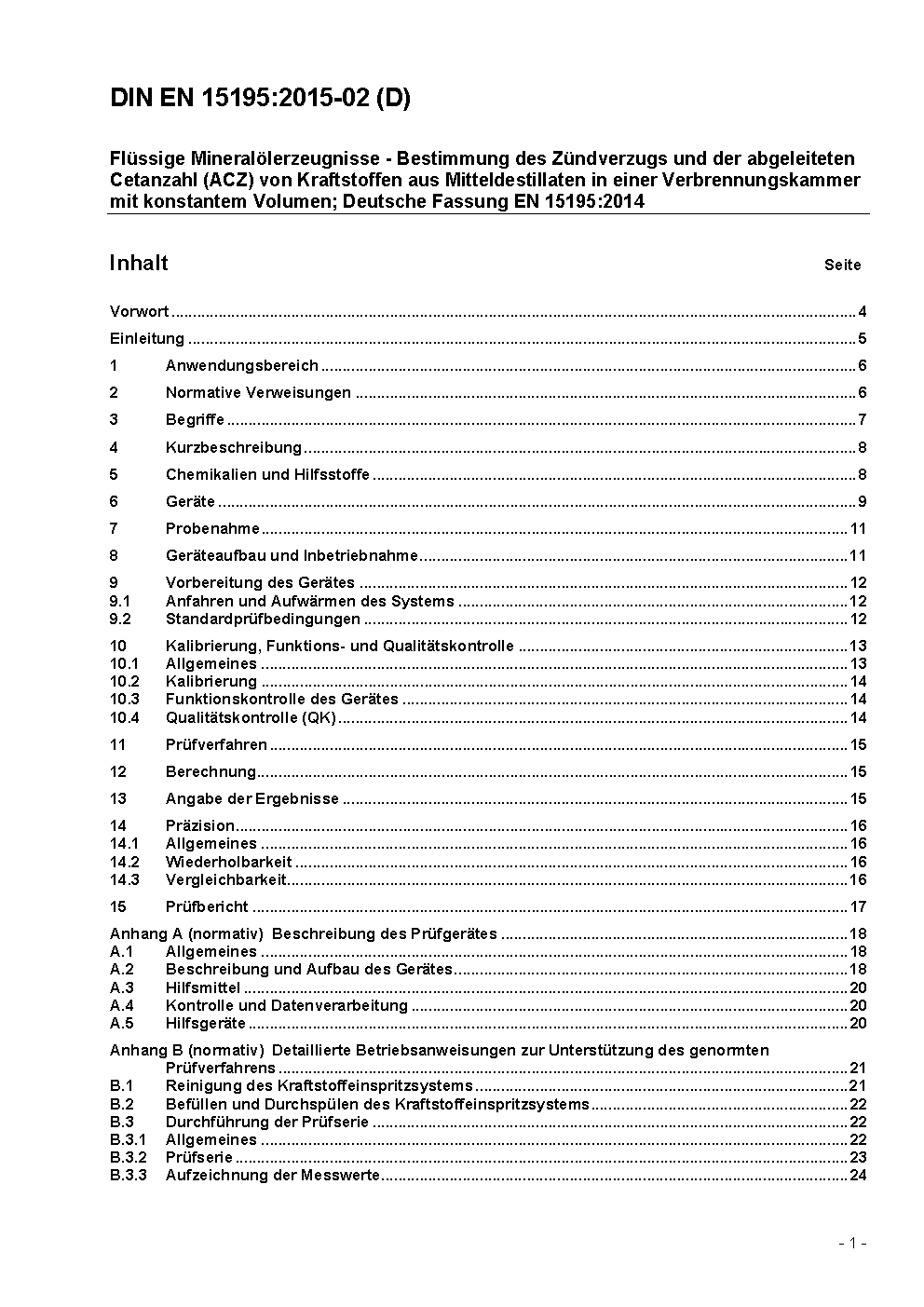 Flüssige Mineralölerzeugnisse - Bestimmung des Zündverzugs und der abgeleiteten Cetanzahl (ACZ) von Kraftstoffen aus Mitteldestillaten in einer Verbrennungskammer mit konstantem Volumen; Deutsche Fassung EN 15195:2007