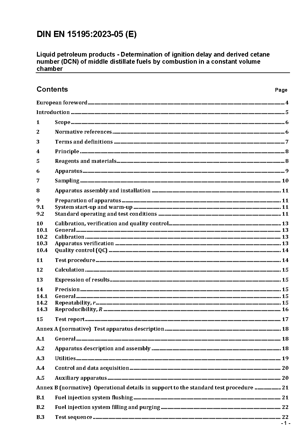 Liquid petroleum products - Determination of ignition delay and derived cetane number (DCN) of middle distillate fuels by combustion in a constant volume chamber; German version EN 15195:2007