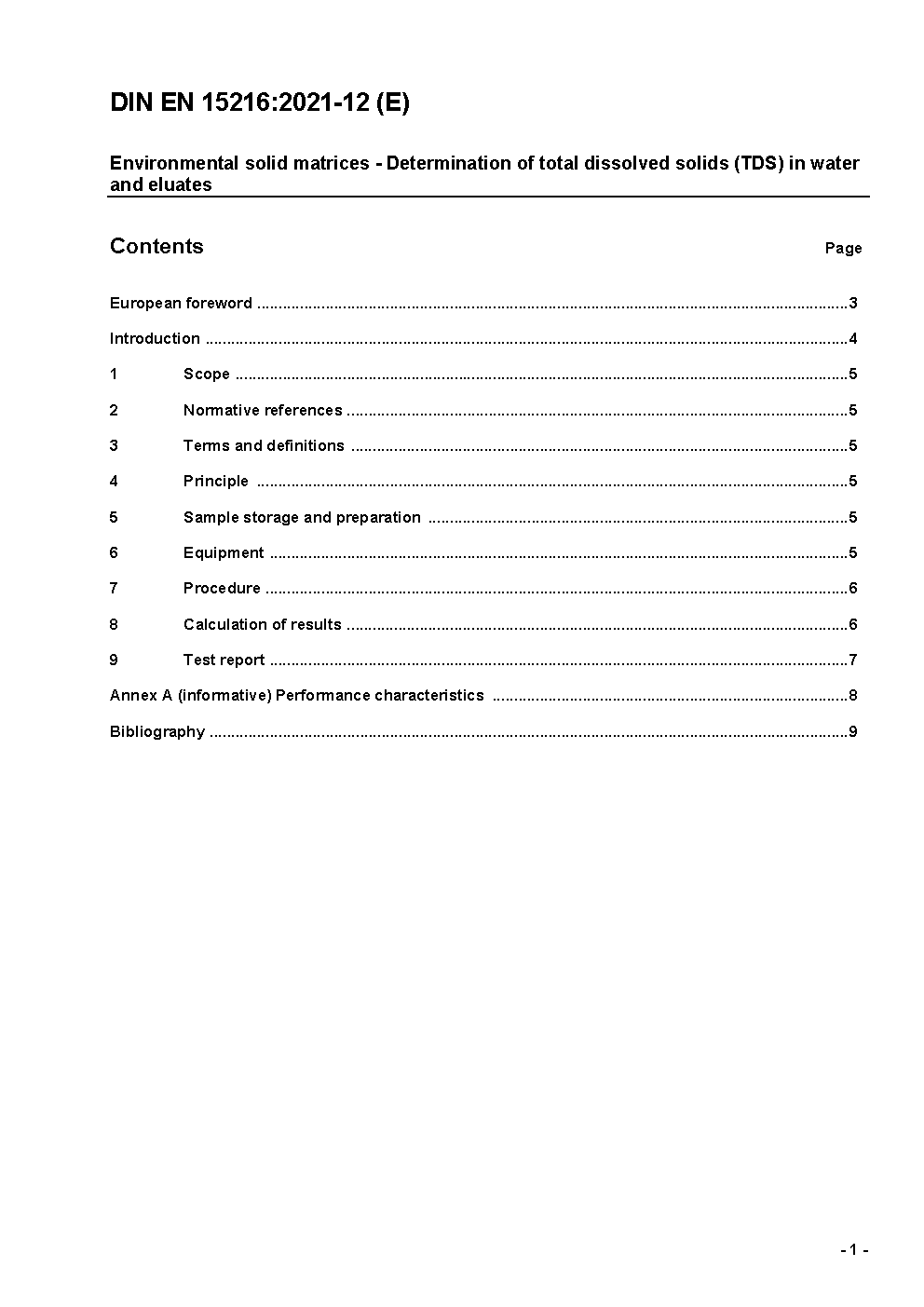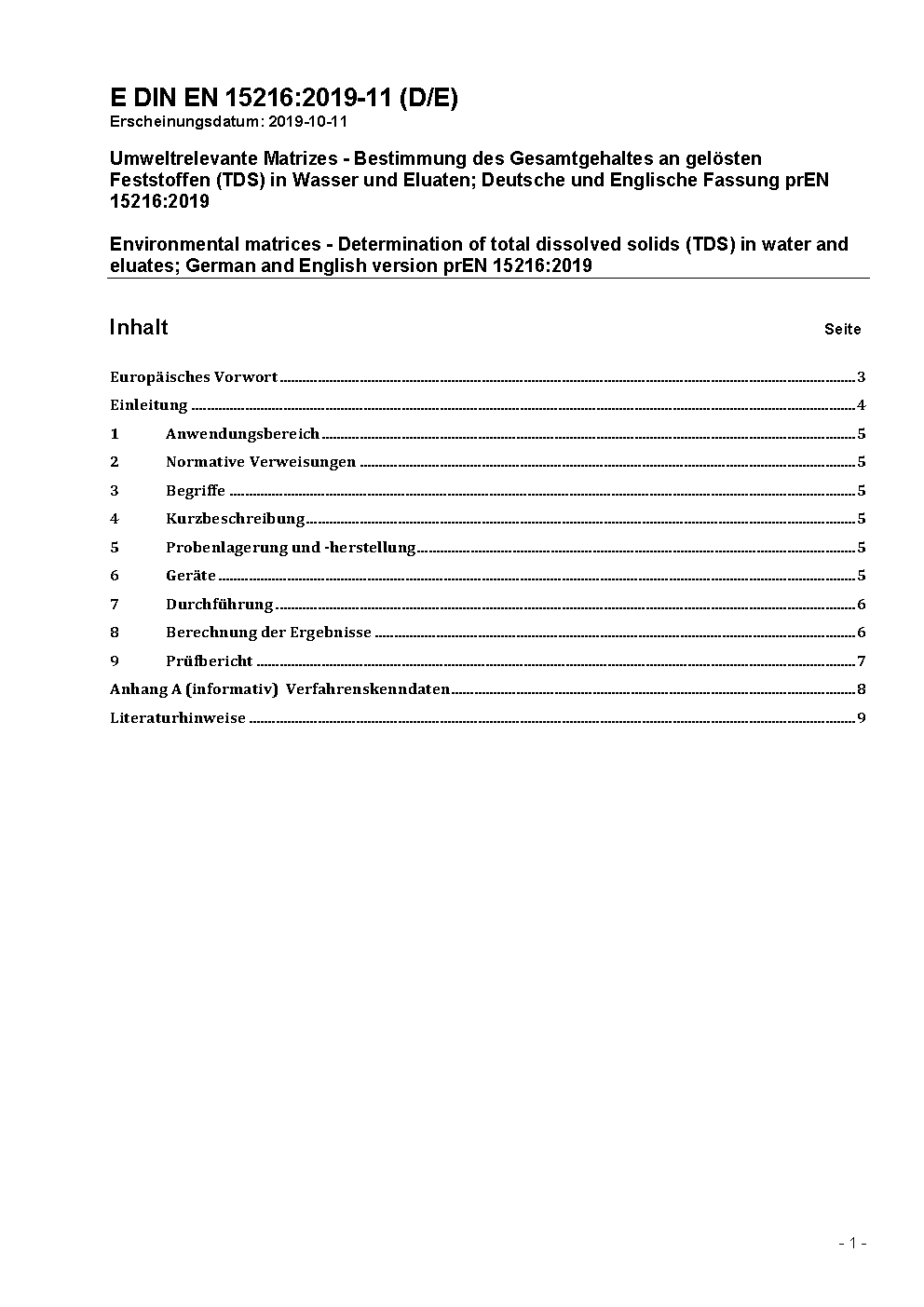 Feststoffe in der Umwelt - Bestimmung des Gesamtgehaltes an gelösten Feststoffen (TDS) in Wasser und Eluaten; Deutsche Fassung EN 15216:2021