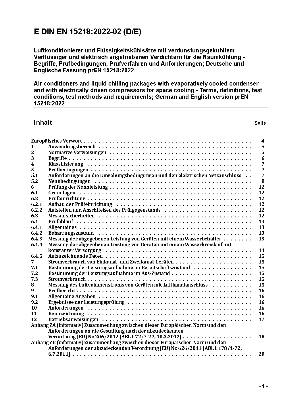 Luftkonditionierer und Flüssigkeitskühlsätze mit verdunstungsgekühltem Verflüssiger und elektrisch angetriebenen Verdichtern für die Raumkühlung - Begriffe, Prüfbedingungen, Prüfverfahren und Anforderungen; Deutsche Fassung EN 15218:2013
