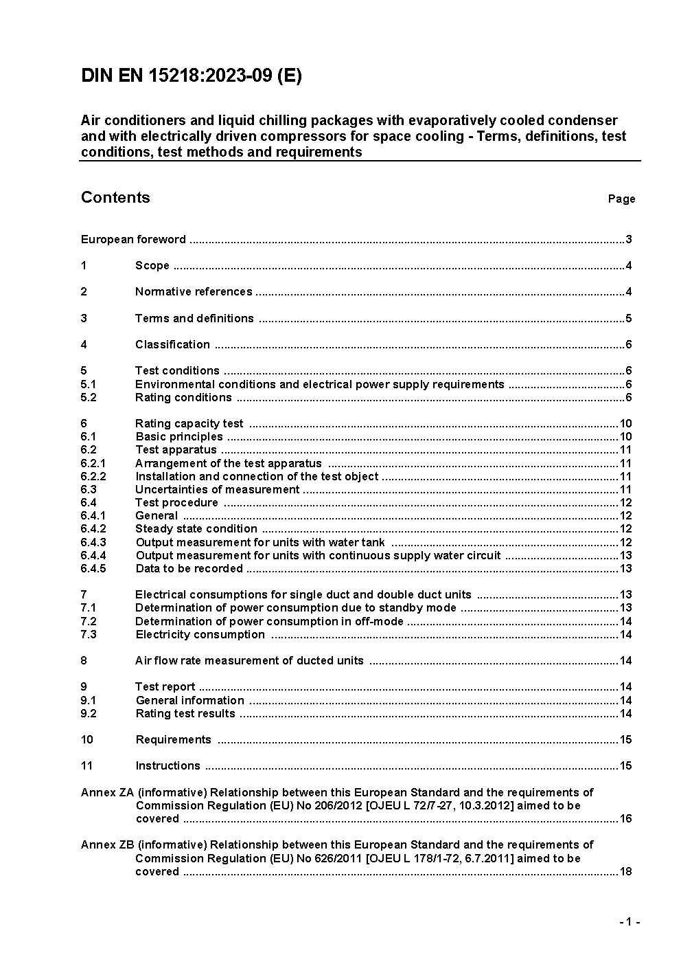 Air conditioners and liquid chilling packages with evaporatively cooled condenser and with electrically driven compressors for space cooling - Terms, definitions, test conditions, test methods and requirements; German version EN 15218:2013