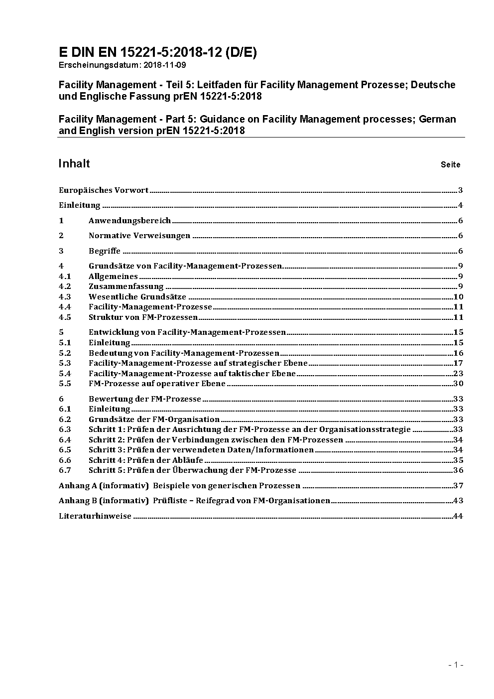 Facility Management - Teil 5: Leitfaden für Facility Management Prozesse; Deutsche Fassung EN 15221-5:2011