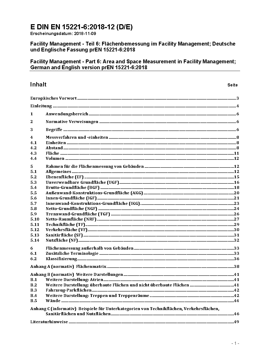 Facility Management - Part 6: Area and Space Measurement in Facility Management; German version EN 15221-6:2011