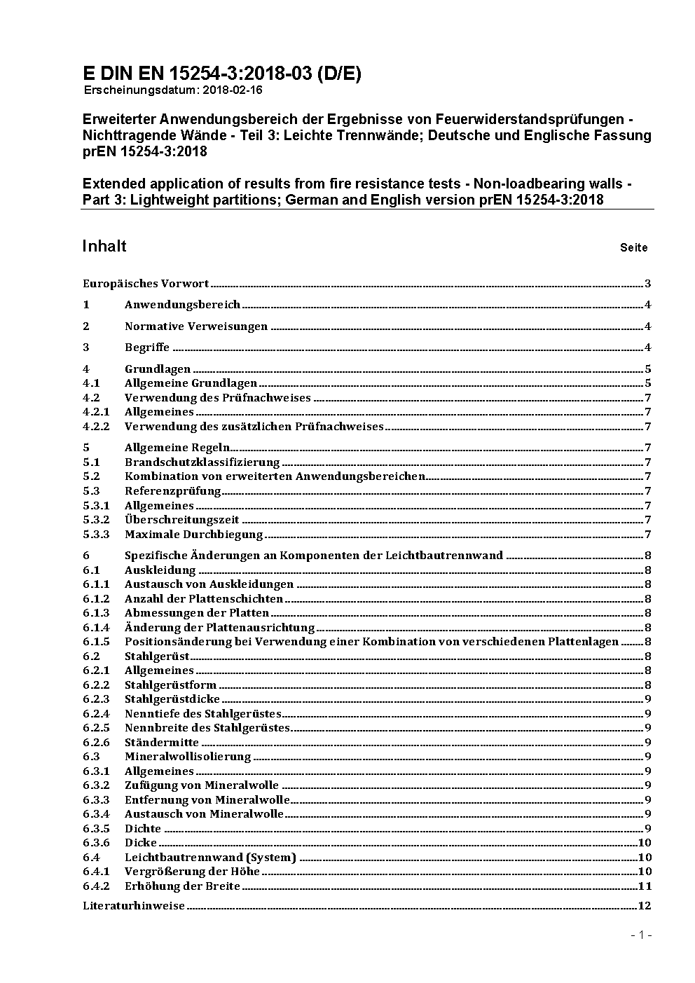 Erweiterter Anwendungsbereich der Ergebnisse von Feuerwiderstandsprüfungen - Nichttragende Wände - Teil 3: Leichte Trennwände; Deutsche und Englische Fassung prEN 15254-3:2018
