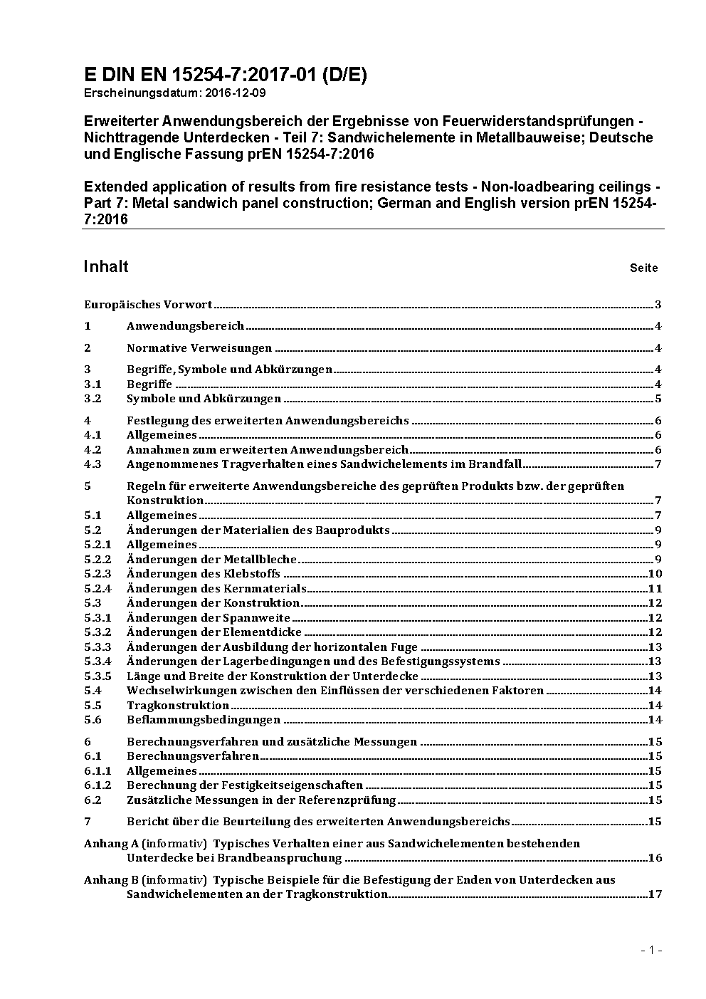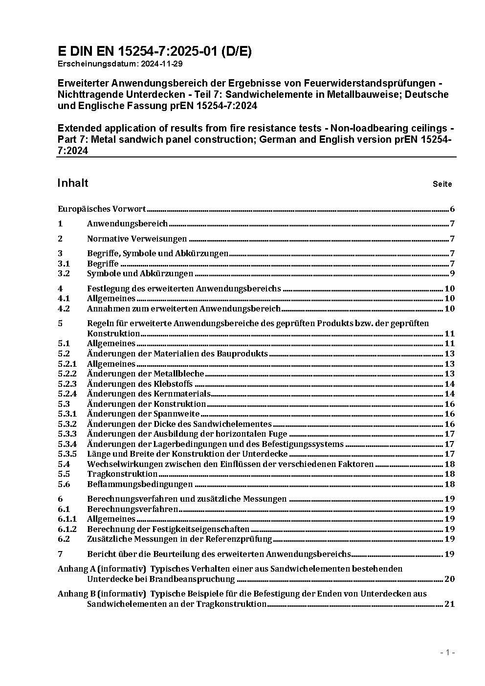 Erweiterter Anwendungsbereich der Ergebnisse von Feuerwiderstandsprüfungen - Nichttragende Unterdecken - Teil 7: Sandwichelemente in Metallbauweise; Deutsche und Englische Fassung prEN 15254-7:2024