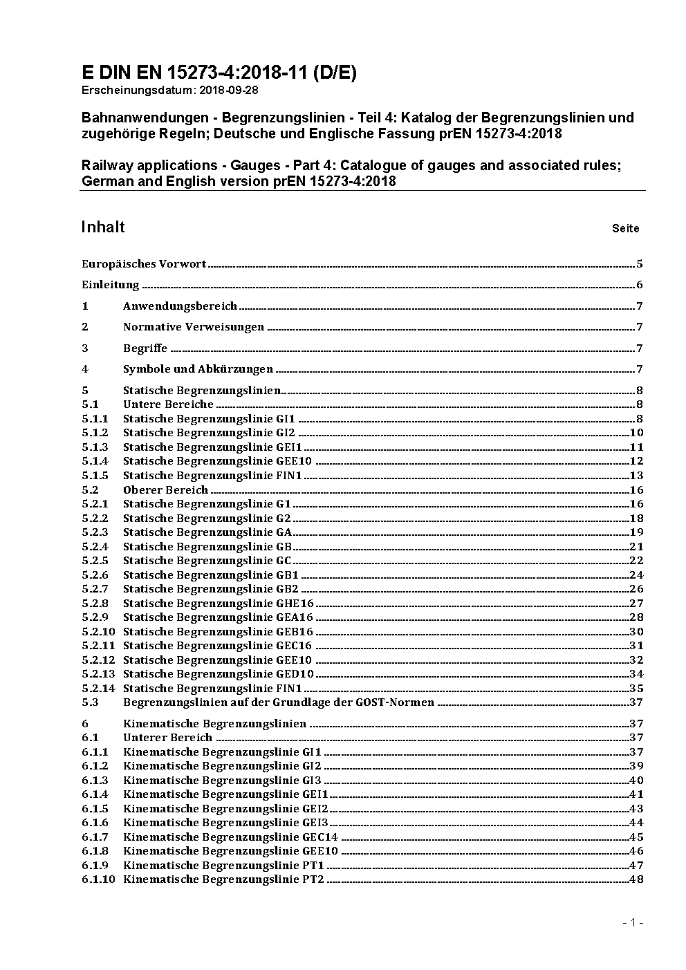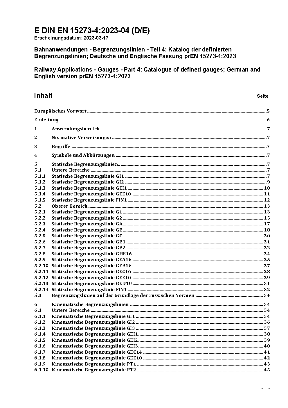 Railway Applications - Gauges - Part 4: Catalogue of defined gauges; German and English version prEN 15273-4:2023.