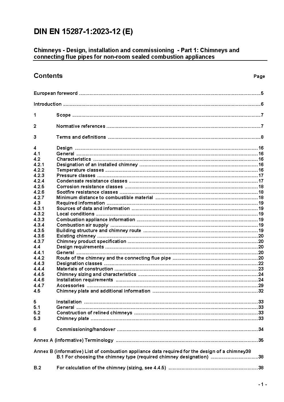 Chimneys - Design, installation and commissioning - Part 1: Chimneys and connecting flue pipes for non-room sealed combustion appliances; German version EN 15287-1:2023
