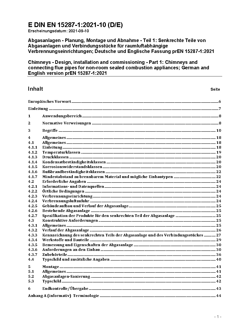 Abgasanlagen - Planung, Montage und Abnahme - Teil 1: Senkrechte Teile von Abgasanlagen und Verbindungsstücke für raumluftabhängige Verbrennungseinrichtungen; Deutsche Fassung EN 15287-1:2023