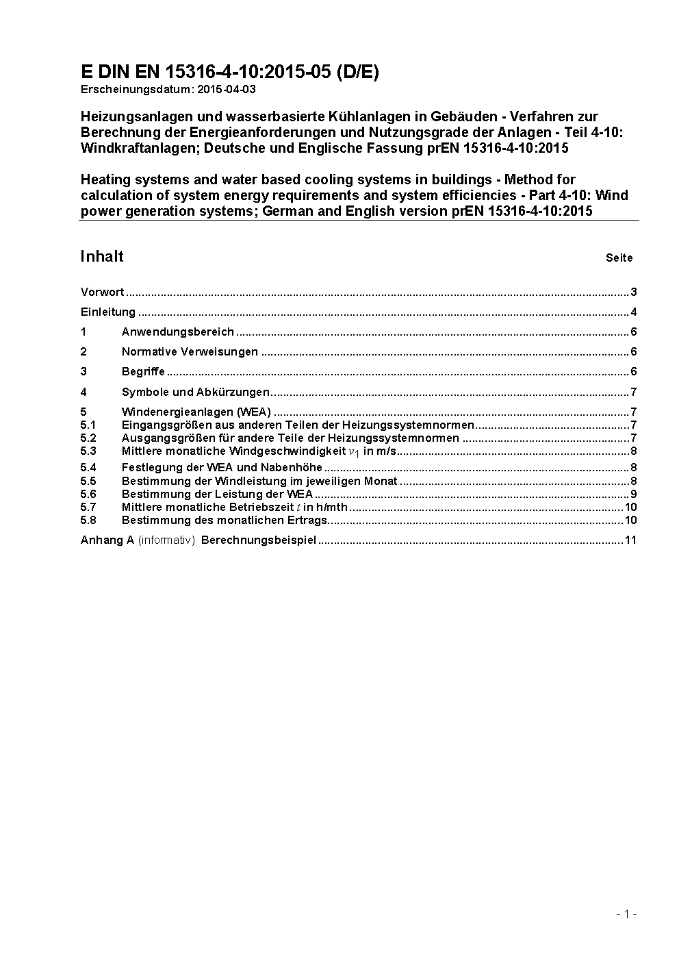 Energetische Bewertung von Gebäuden - Verfahren zur Berechnung der Energieanforderungen und Nutzungsgrade der Anlagen - Teil 4-10: Windkraftanlagen, Modul M11-8-7; Deutsche Fassung EN 15316-4-10:2017