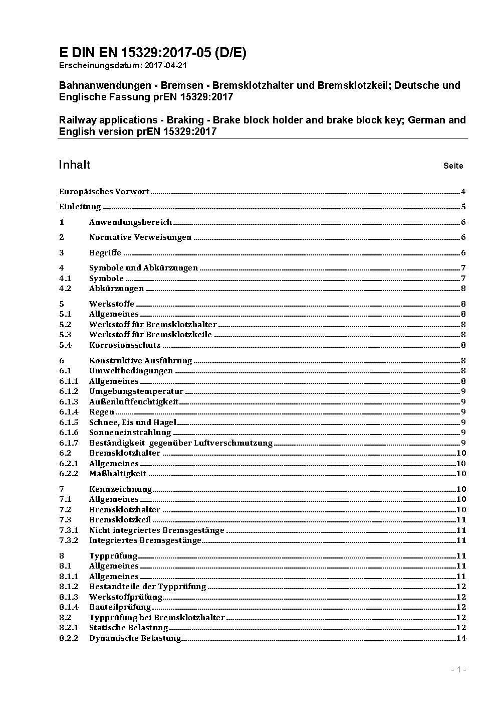 Bahnanwendungen - Bremsen - Bremsklotzhalter und Bremsklotzkeil; Deutsche und Englische Fassung prEN 15329:2017