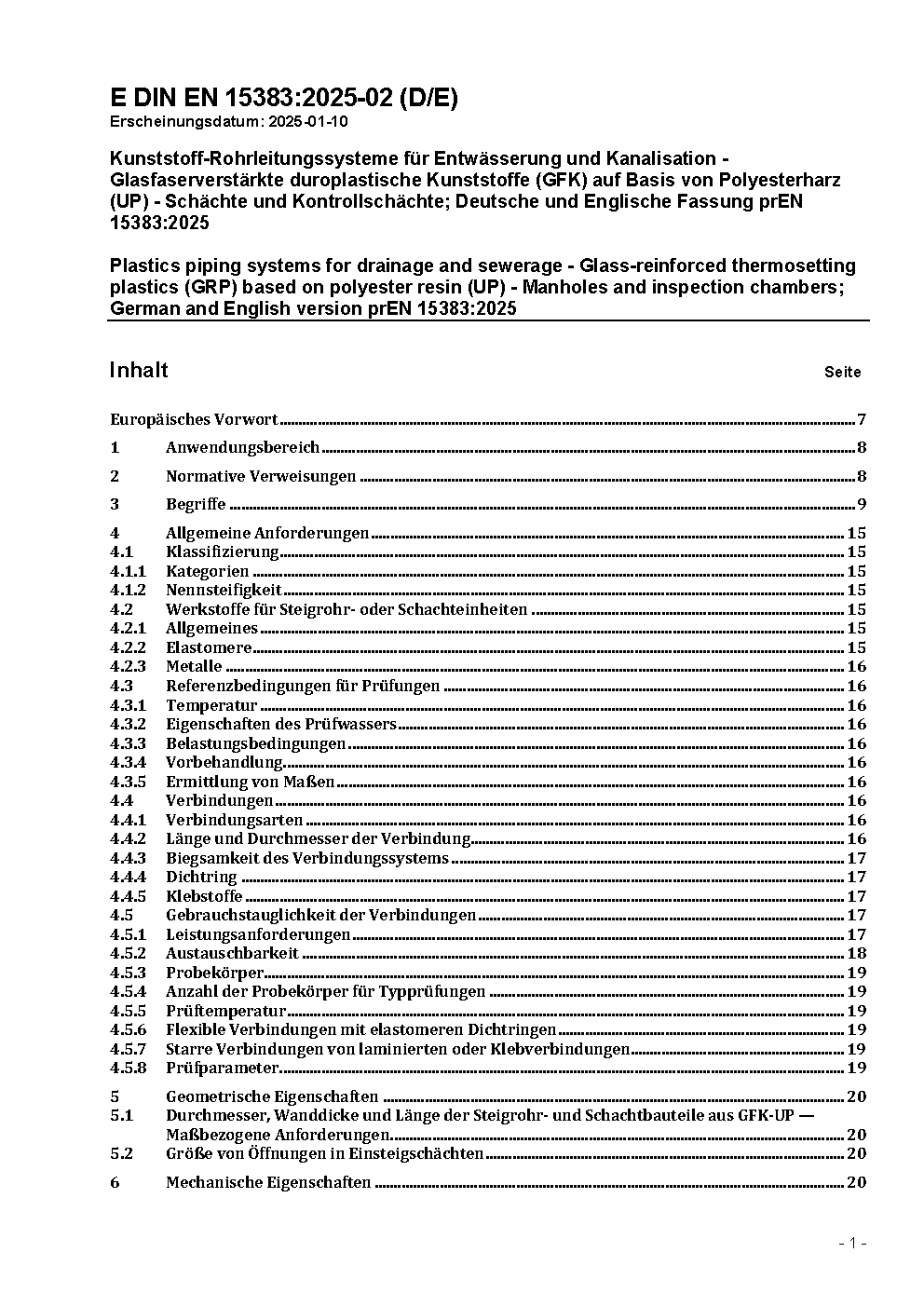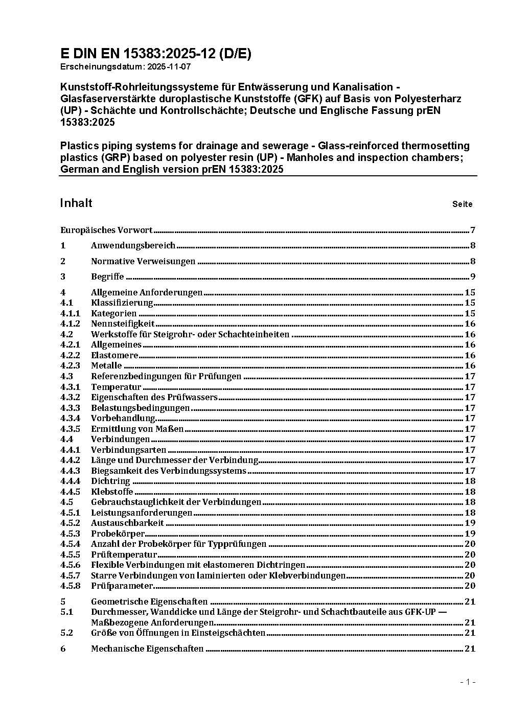 Kunststoff-Rohrleitungssysteme für Abwasserleitungen und -kanäle - Glasfaserverstärkte duroplastische Kunststoffe (GFK) auf der Basis von Polyesterharz (UP) - Einsteig- und Kontrollschächte; Deutsche Fassung EN 15383:2012+A1:2013