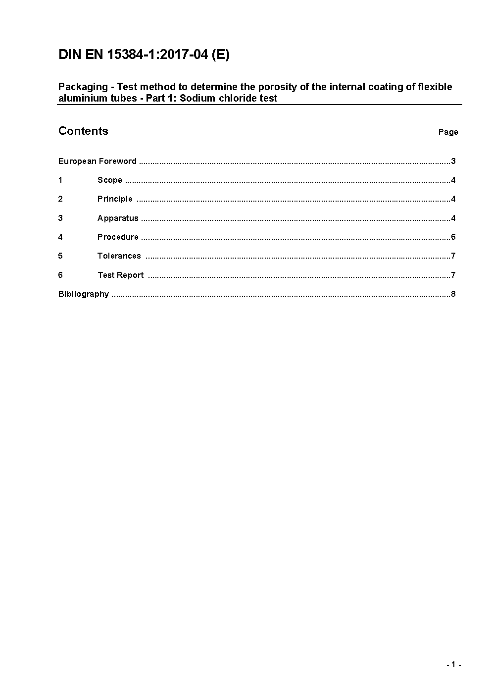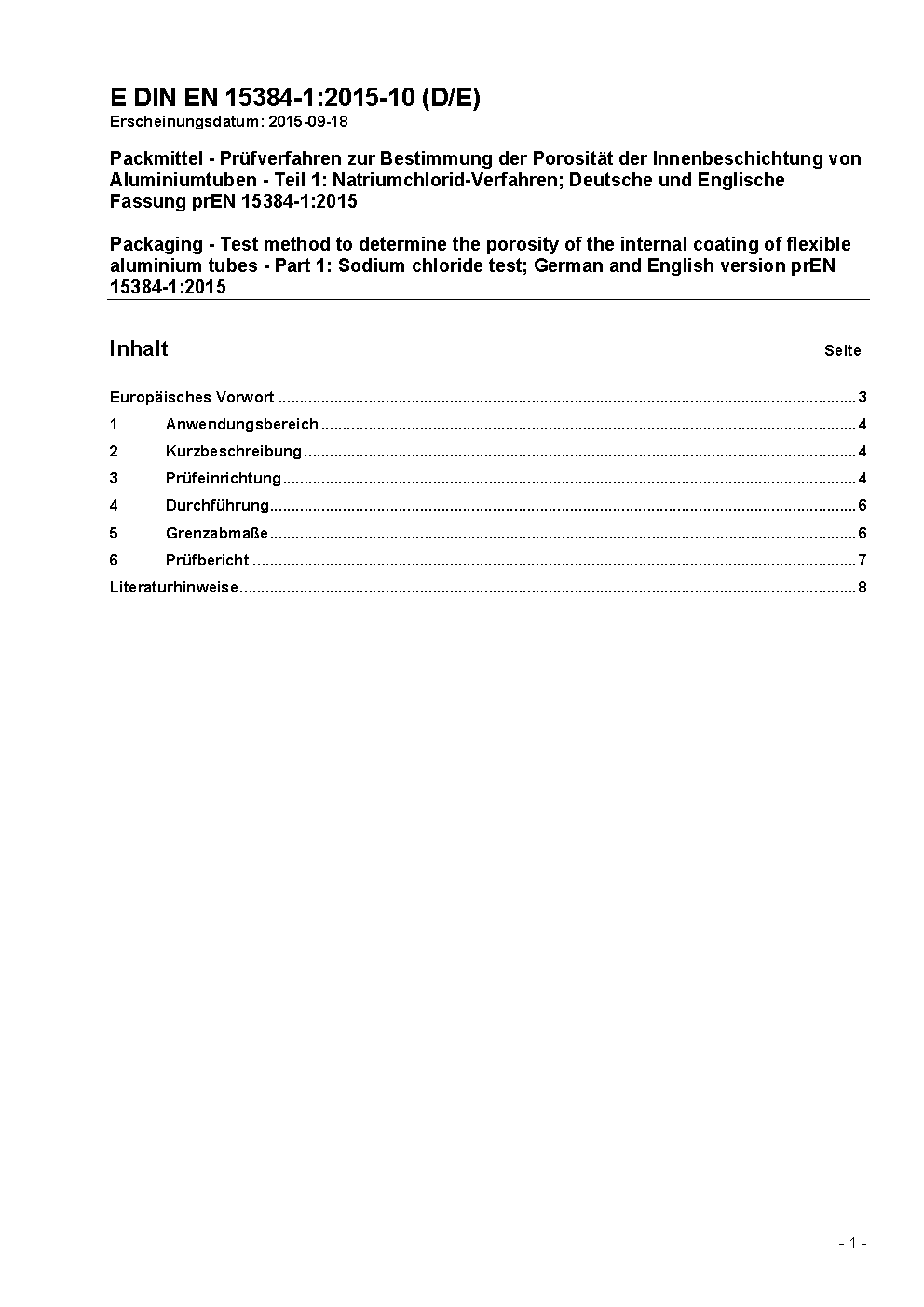 Packmittel - Prüfverfahren zur Bestimmung der Porosität der Innenbeschichtung von Aluminiumtuben - Teil 1: Natriumchlorid-Verfahren; Deutsche und Englische Fassung prEN 15384-1:2015