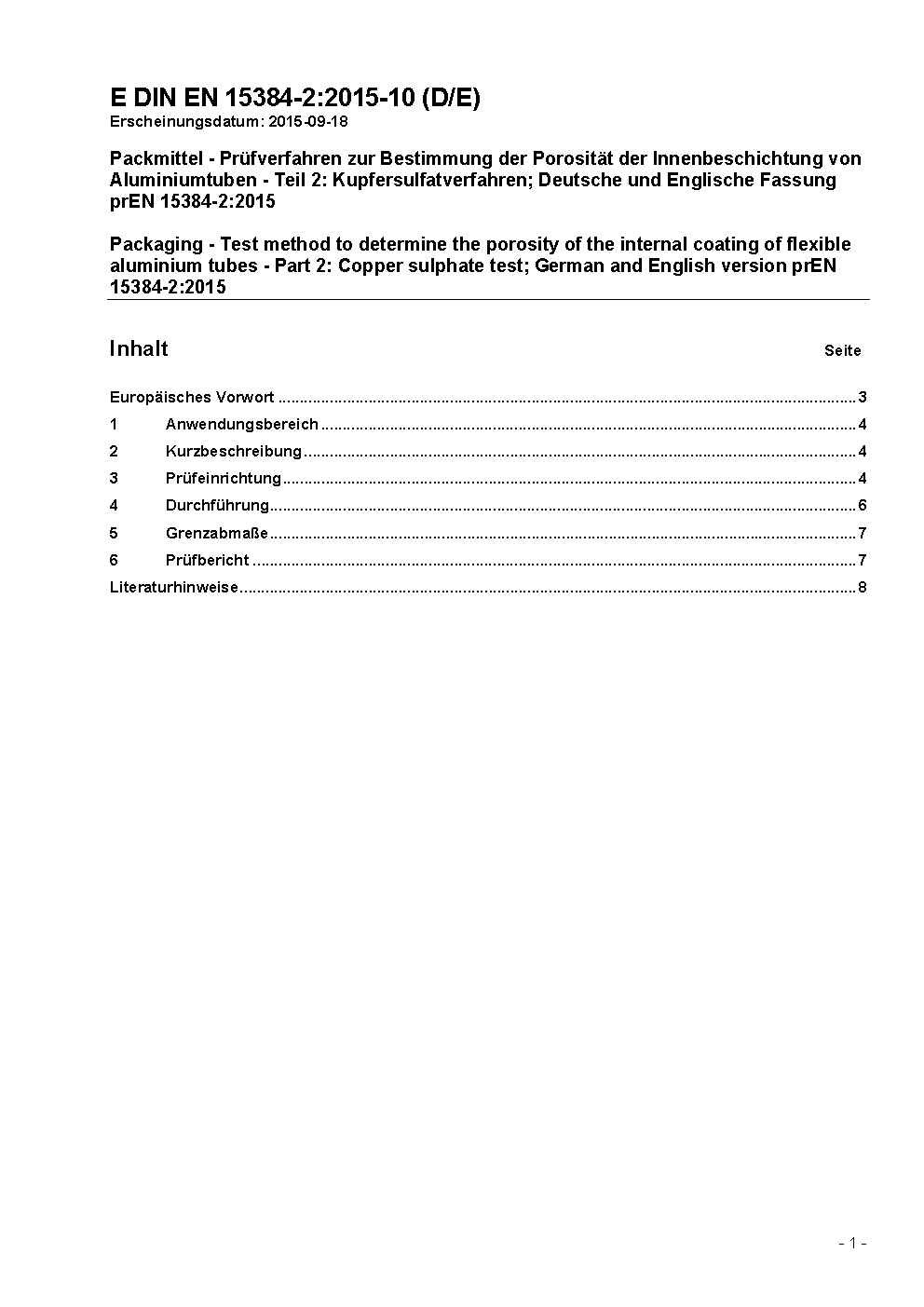 Packmittel - Prüfverfahren zur Bestimmung der Porosität der Innenbeschichtung von Aluminiumtuben - Teil 2: Kupfersulfatverfahren; Deutsche und Englische Fassung prEN 15384-2:2015
