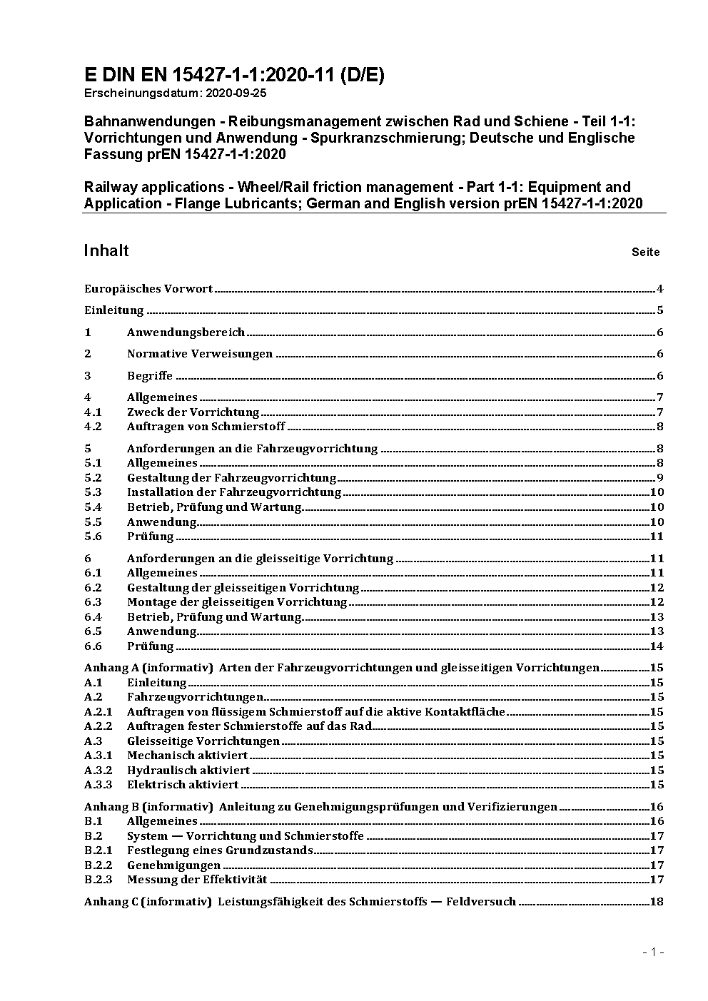 Bahnanwendungen - Reibungsmanagement zwischen Rad und Schiene - Teil 1-1: Vorrichtungen und Anwendung - Spurkranzschmierung; Deutsche und Englische Fassung prEN 15427-1-1:2020