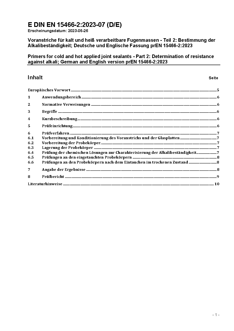 Voranstriche für kalt und heiß verarbeitbare Fugenmassen - Teil 2: Bestimmung der Alkalibeständigkeit; Deutsche und Englische Fassung prEN 15466-2:2023