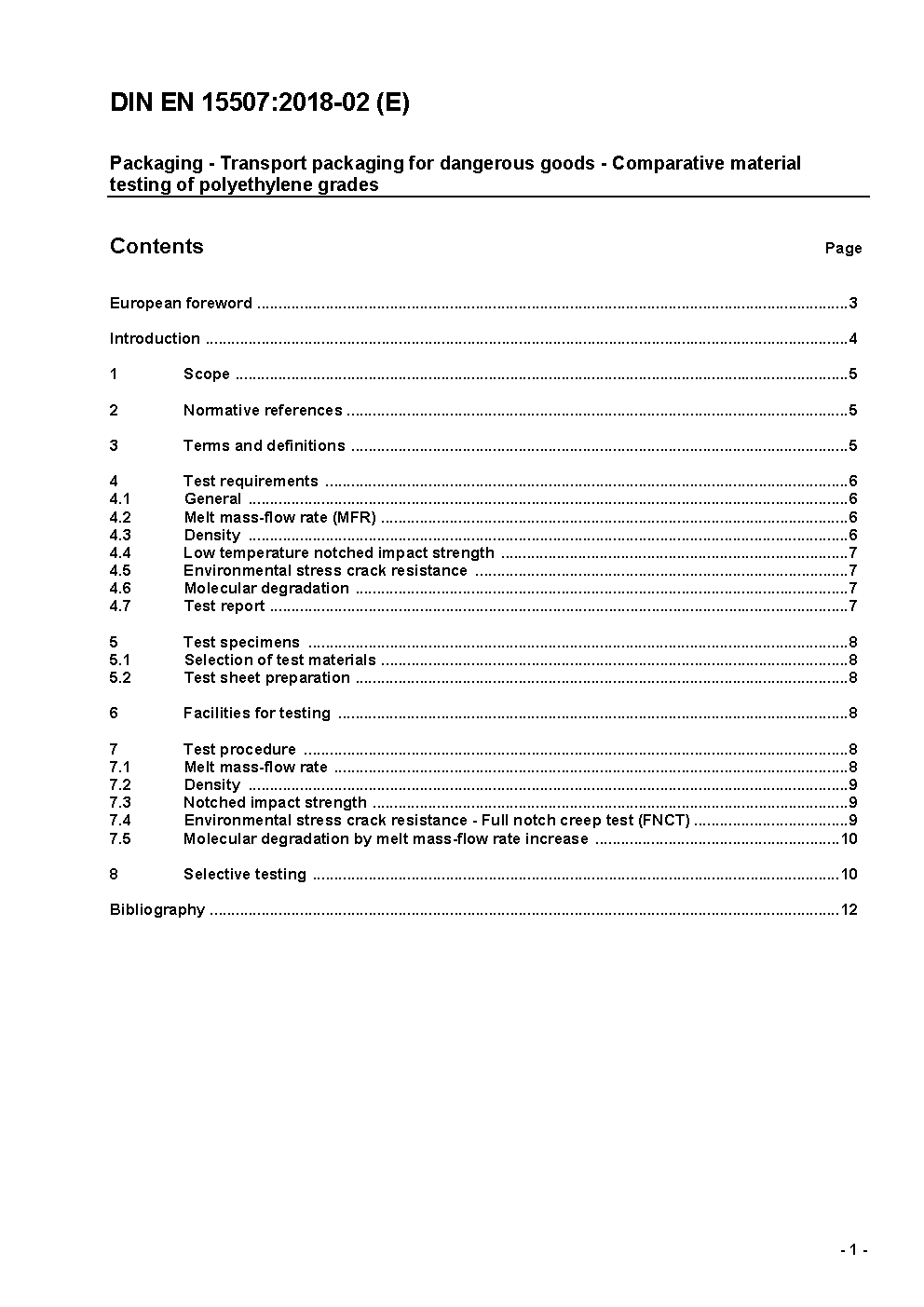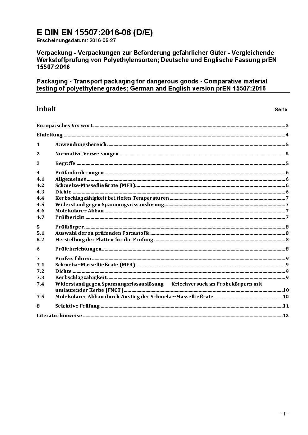 Packaging - Transport packaging for dangerous goods - Comparative material testing of polyethylene grades; German version EN 15507:2008
