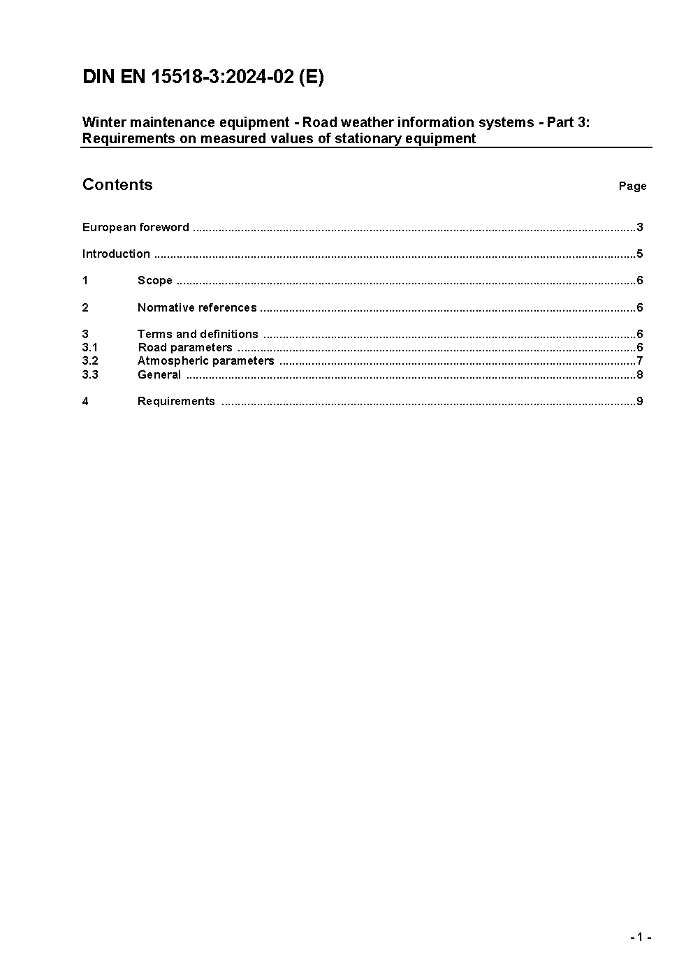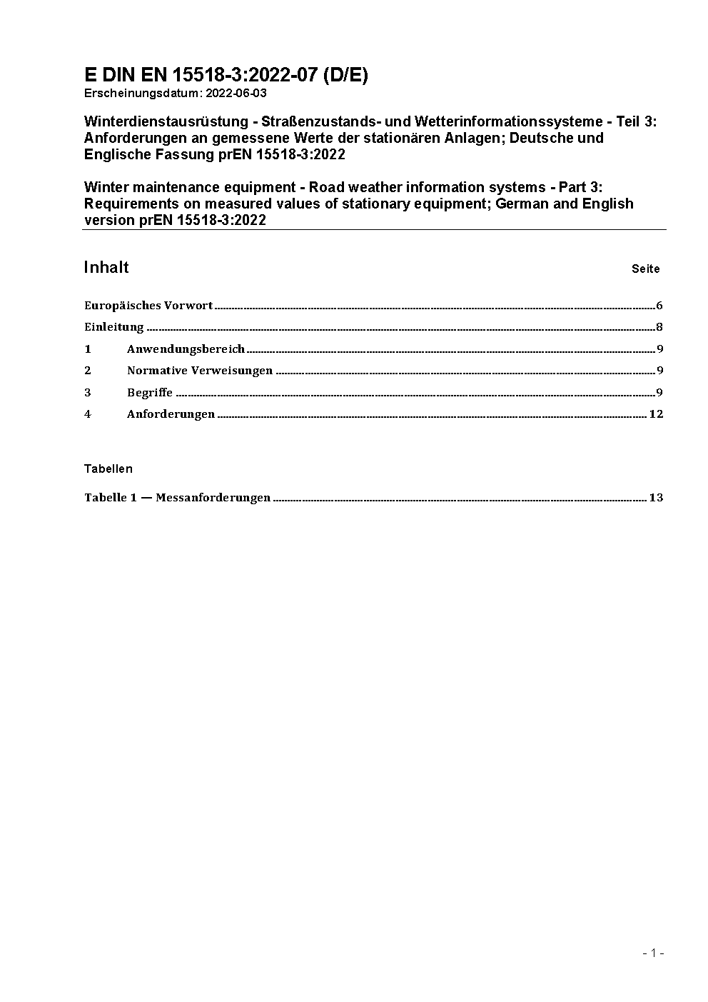 Winterdienstausrüstung - Straßenzustands- und Wetterinformationssysteme - Teil 3: Anforderungen an gemessene Werte der stationären Anlagen; Deutsche und Englische Fassung prEN 15518-3:2022