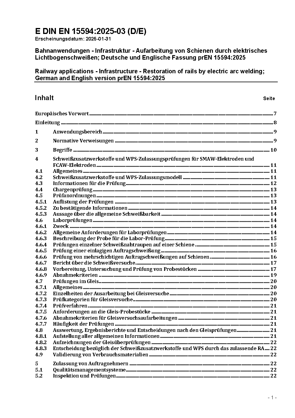 Bahnanwendungen - Oberbau - Aufarbeiten von Schienen durch elektrisches Lichtbogenauftragschweißen; Deutsche Fassung EN 15594:2009