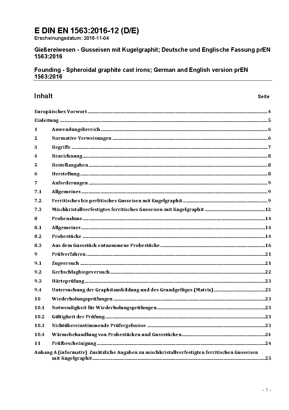 Gießereiwesen - Gusseisen mit Kugelgraphit; Deutsche und Englische Fassung prEN 1563:2016