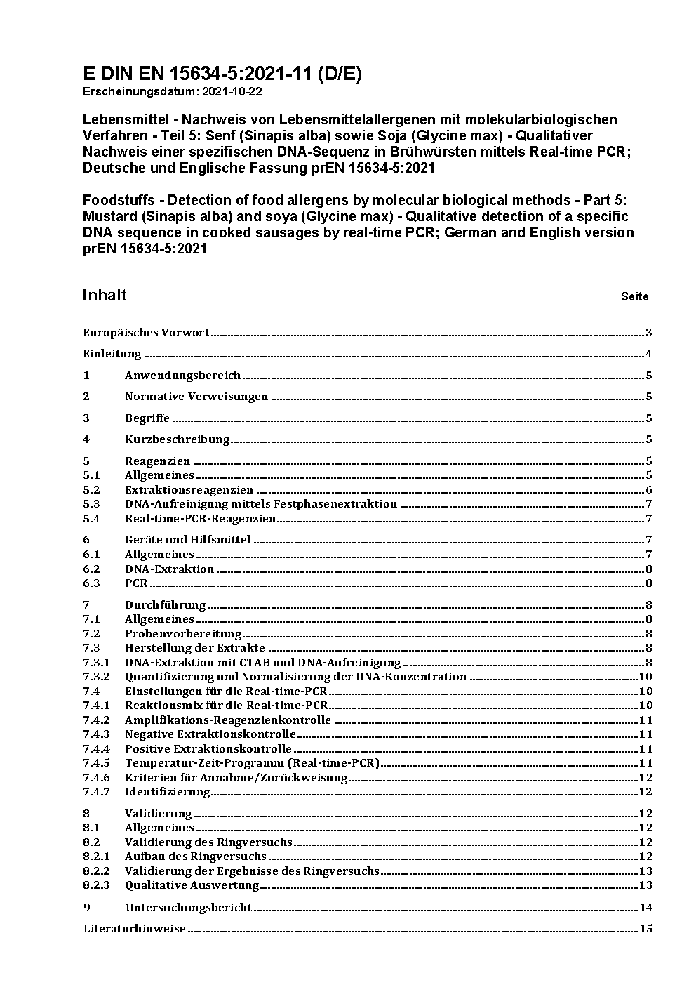 Lebensmittel - Nachweis von Lebensmittelallergenen mit molekularbiologischen Verfahren - Teil 5: Senf (Sinapis alba) sowie Soja (Glycine max) - Qualitativer Nachweis einer spezifischen DNA-Sequenz in Brühwürsten mittels Real-time PCR; Deutsche und Englische Fassung prEN 15634-5:2021