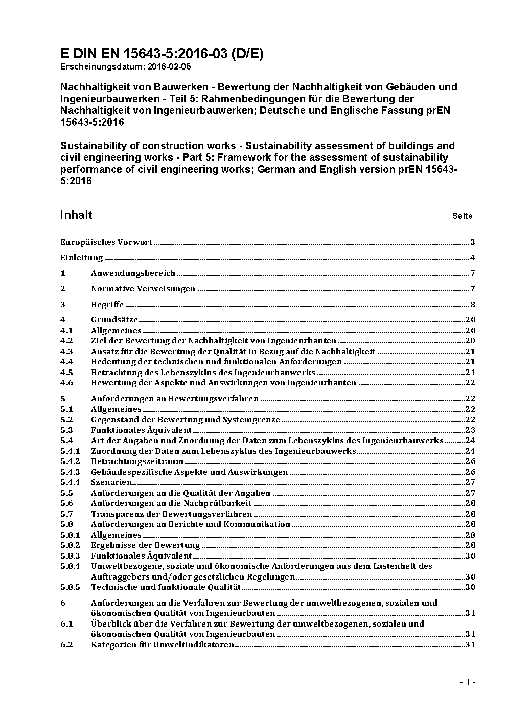 Sustainability of construction works - Sustainability assessment of buildings and civil engineering works - Part 5: Framework on specific principles and requirement for civil engineering works; German version EN 15643-5:2017