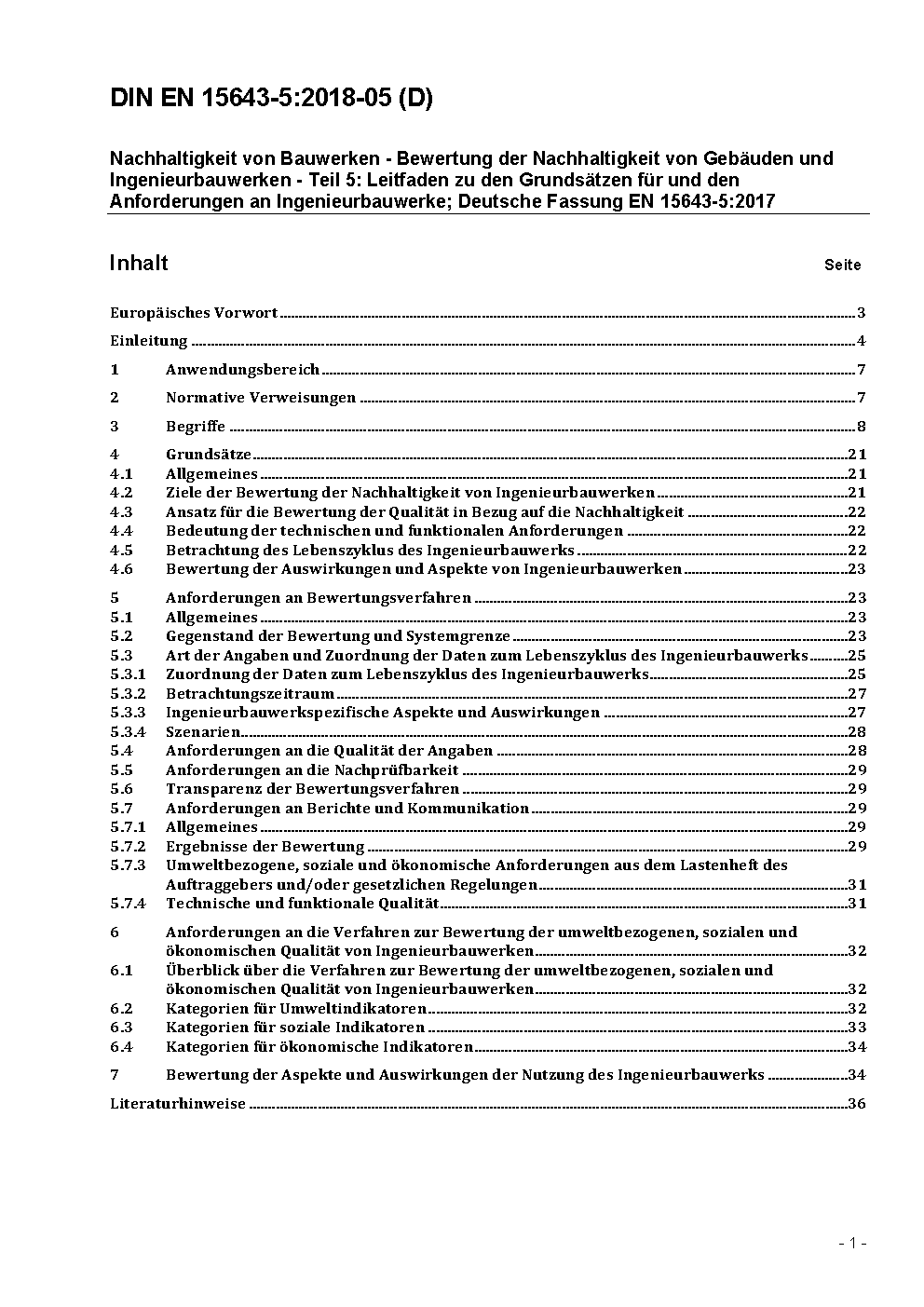 Nachhaltigkeit von Bauwerken - Bewertung der Nachhaltigkeit von Gebäuden und Ingenieurbauwerken - Teil 5: Leitfaden zu den Grundsätzen für und den Anforderungen an Ingenieurbauwerke; Deutsche Fassung EN 15643-5:2017