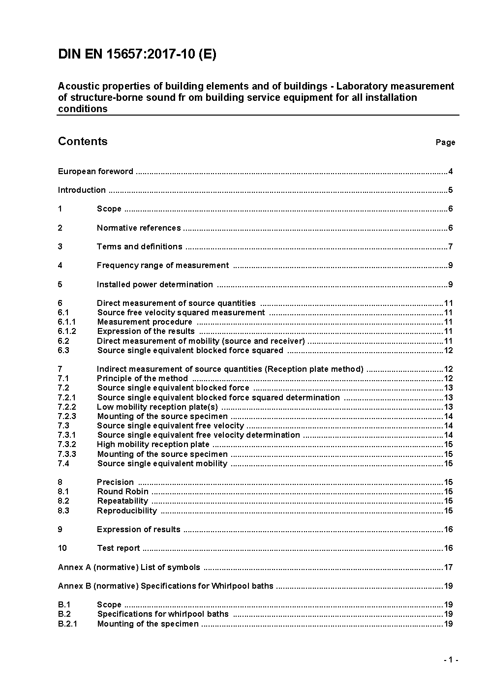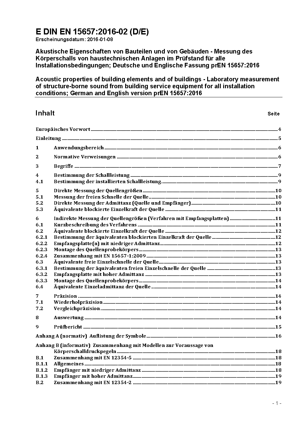 Acoustic properties of building elements and of buildings - Laboratory measurement of structure-borne sound from building service equipment for all installation conditions; German version EN 15657:2017