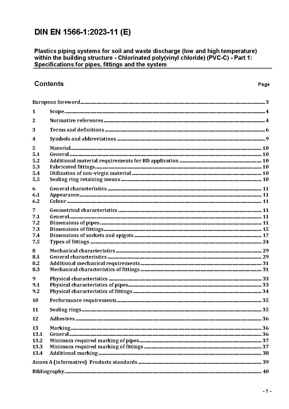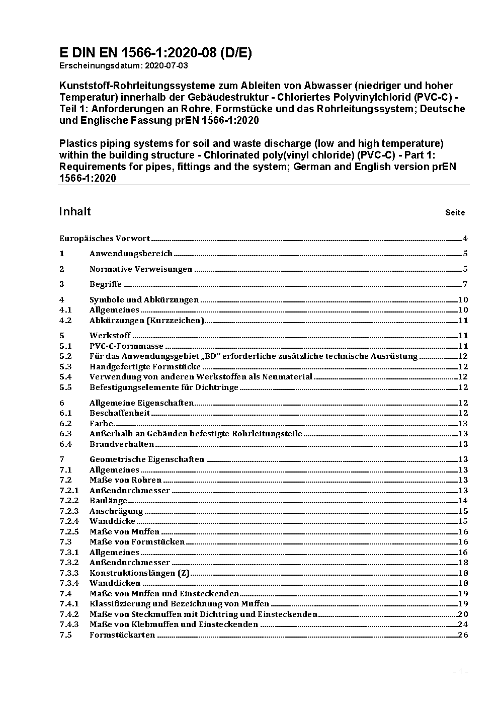 Kunststoff-Rohrleitungssysteme zum Ableiten von Abwasser (niedriger und hoher Temperatur) innerhalb der Gebäudestruktur - Chloriertes Polyvinylchlorid (PVC-C) - Teil 1: Anforderungen an Rohre, Formstücke und das Rohrleitungssystem; Deutsche Fassung EN 1566-1:1998 / Achtung: Daneben gilt DIN 19538 (1980-06) noch bis 2001-06-30.