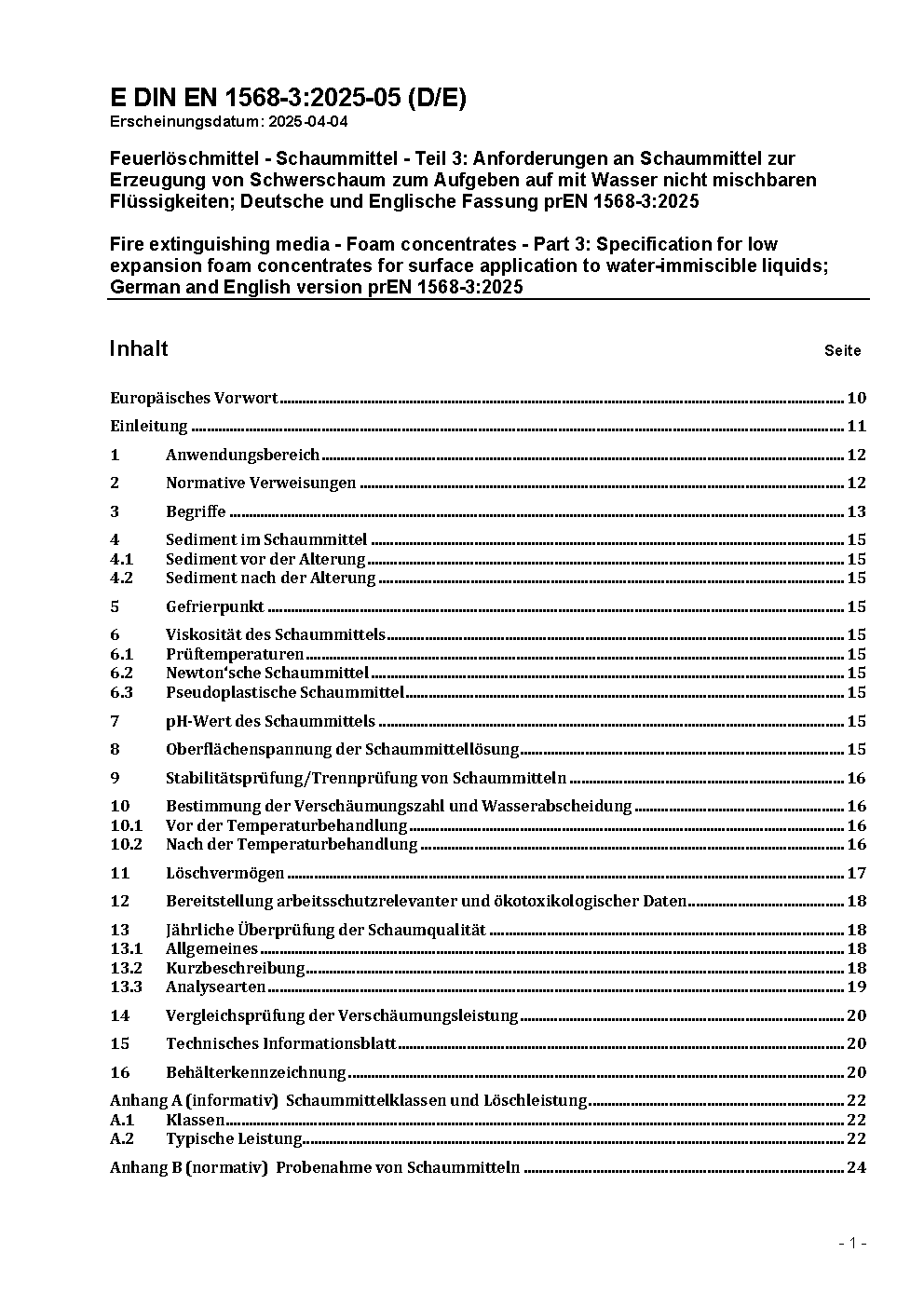 Feuerlöschmittel - Schaummittel - Teil 3: Anforderungen an Schaummittel zur Erzeugung von Schwerschaum zum Aufgeben auf nicht-polare Flüssigkeiten