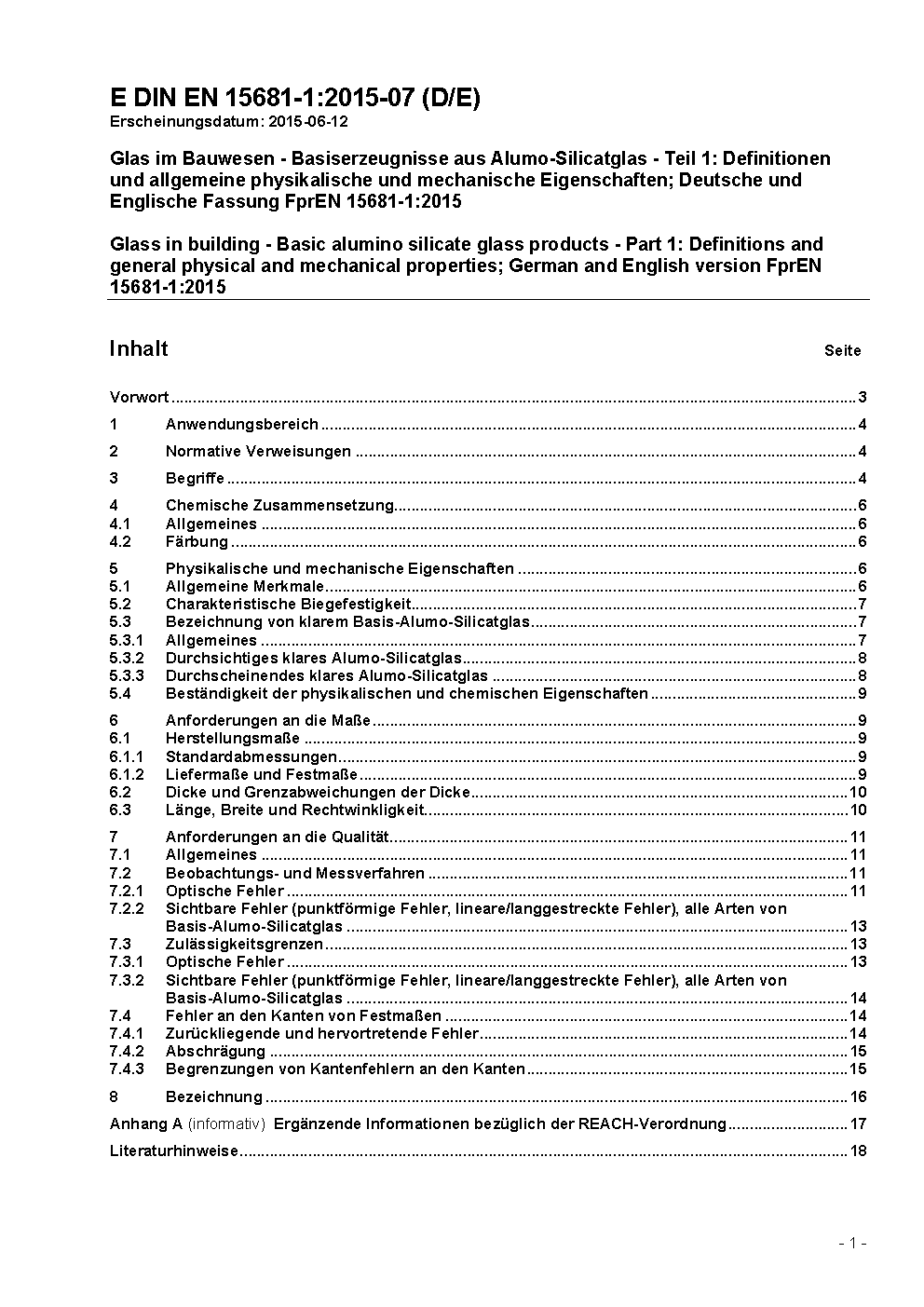 Glas im Bauwesen - Basiserzeugnisse aus Alumo-Silicatglas - Teil 1: Definitionen und allgemeine physikalische und mechanische Eigenschaften; Deutsche Fassung prEN 15681-1:2007