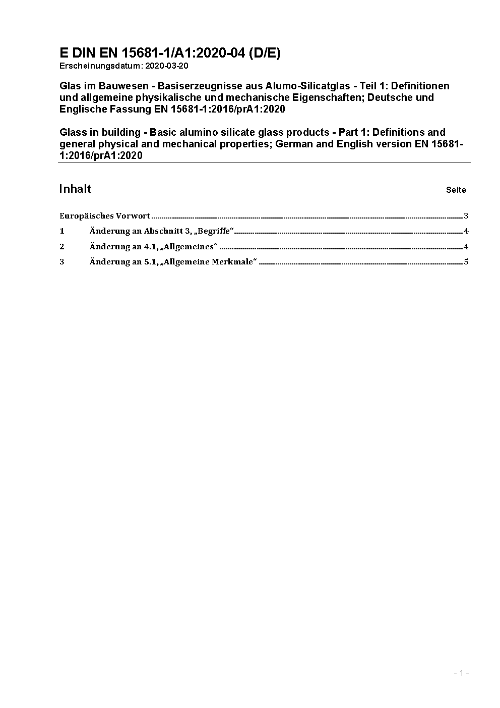 Glass in building - Basic alumino silicate glass products - Part 1: Definitions and general physical and mechanical properties; German version prEN 15681-1:2007