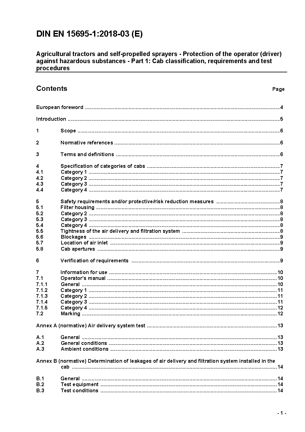 Agricultural tractors and self-propelled sprayers - Protection of the operator (driver) against hazardous substances - Part 1: Cab classification, requirements and test procedures; German version EN 15695-1:2009