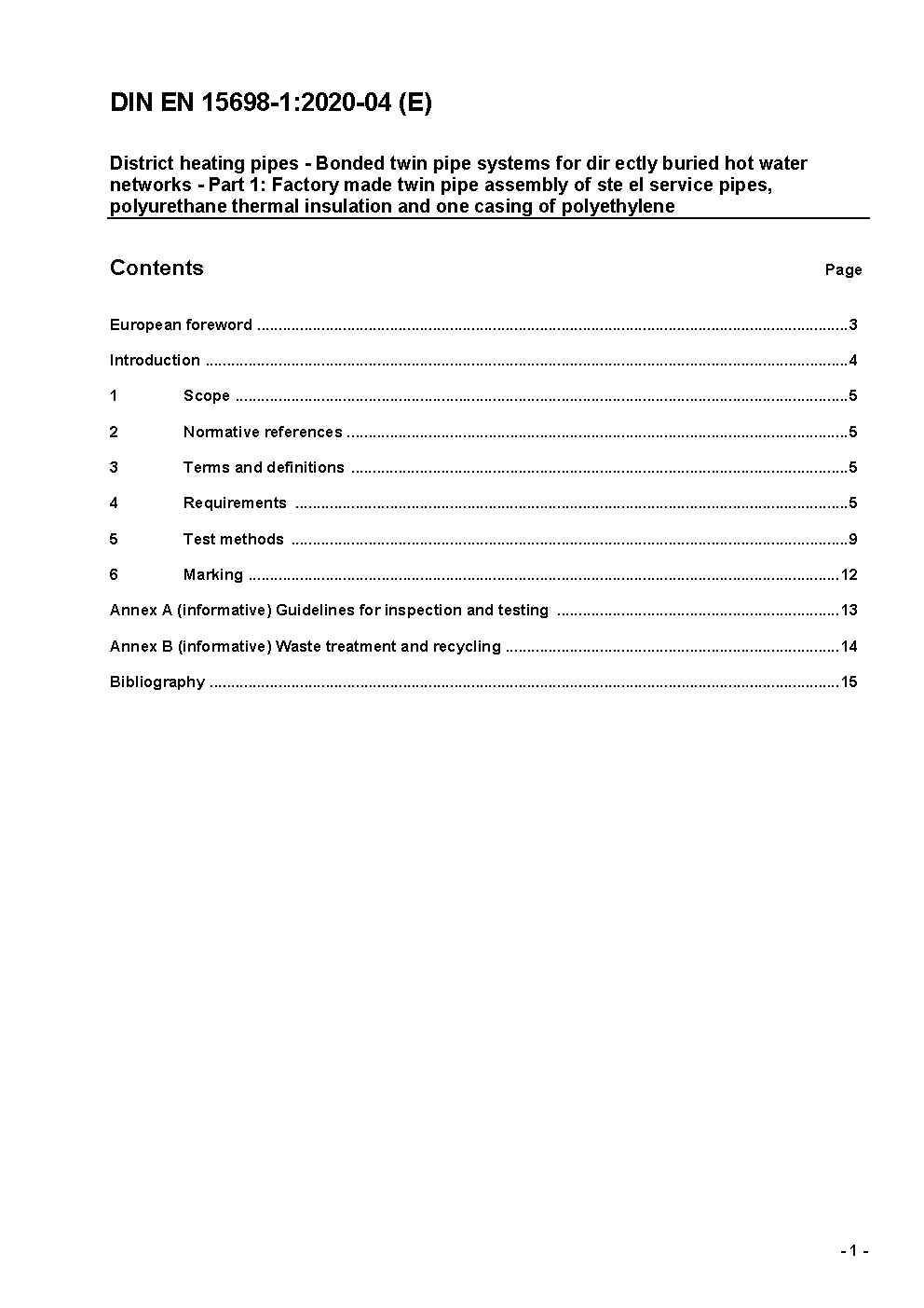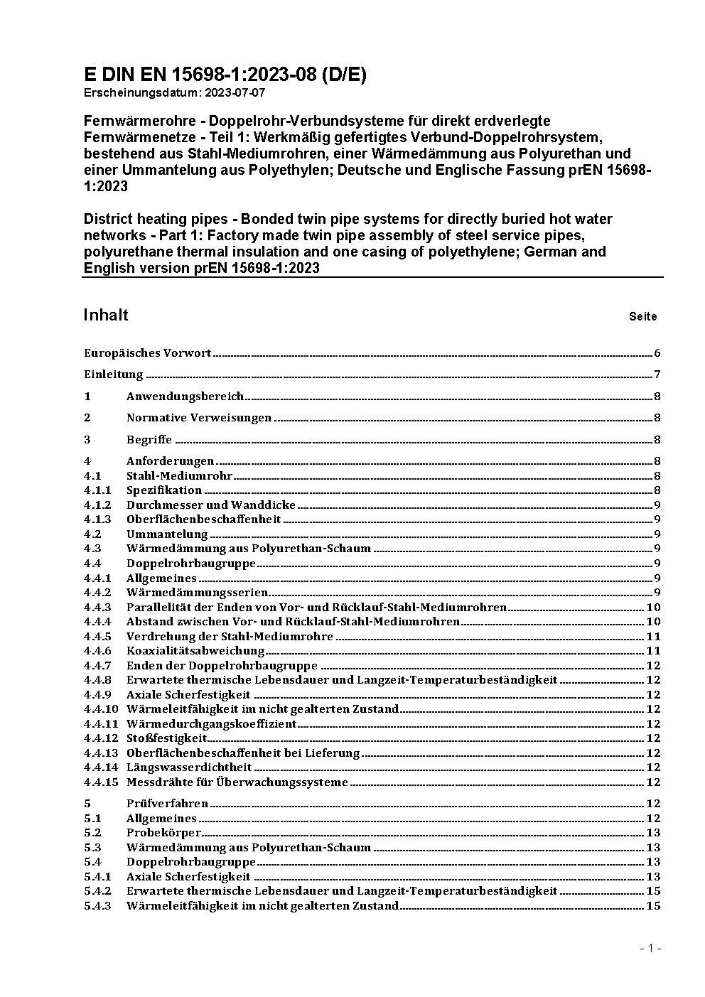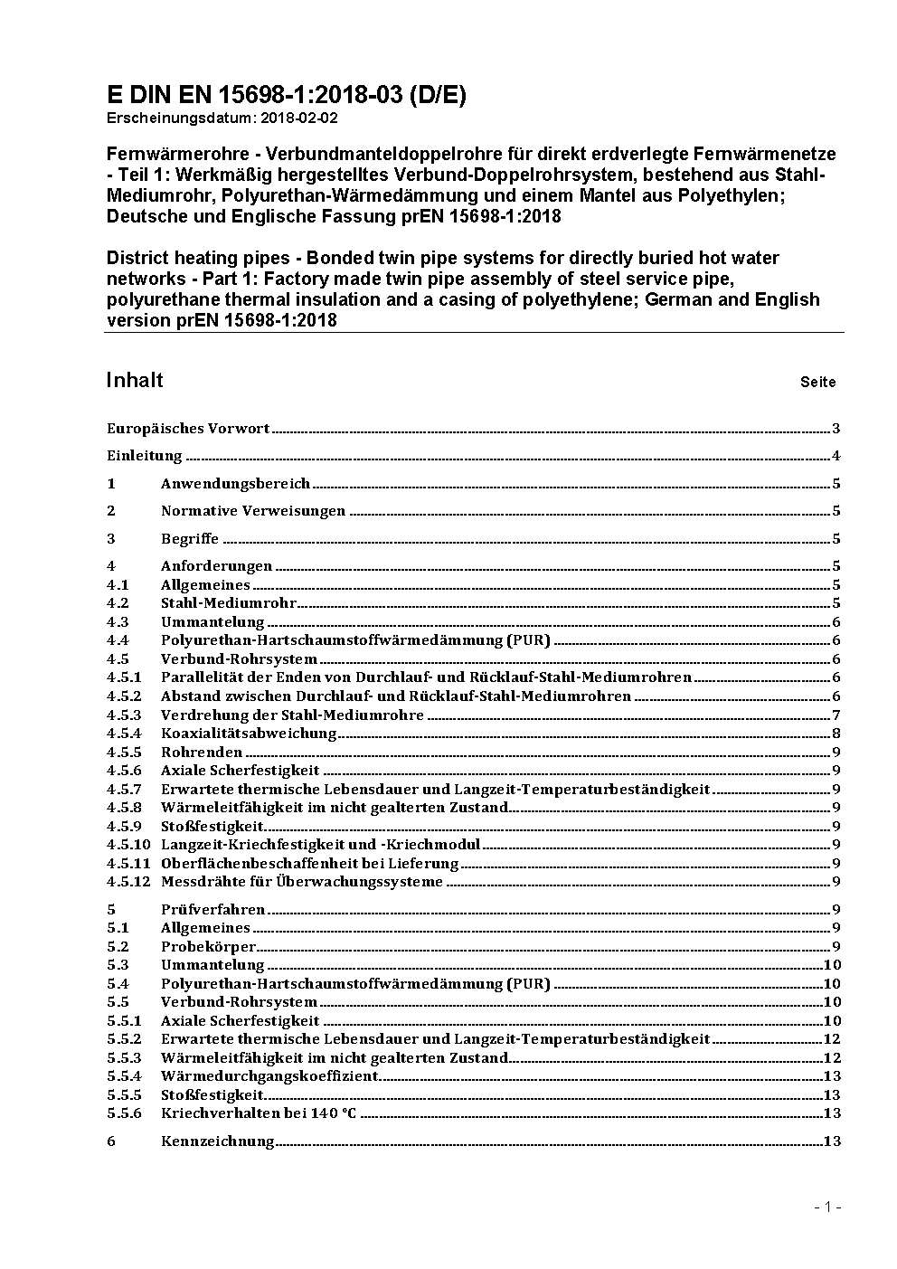 Fernwärmerohre - Werkmäßig gedämmte Verbundmanteldoppelrohre für direkt erdverlegte Fernwärmenetze - Teil 1: Verbund-Doppelrohrsystem bestehend aus zwei Stahl-Mediumrohren, Polyurethan-Wärmedämmung und einem Außenmantel aus Polyethylen; Deutsche und Englische Fassung EN 15698-1:2009