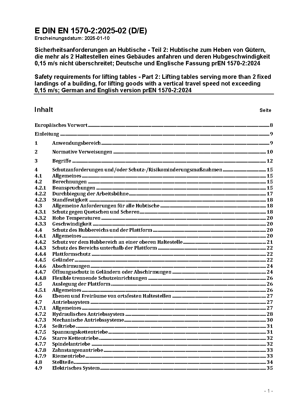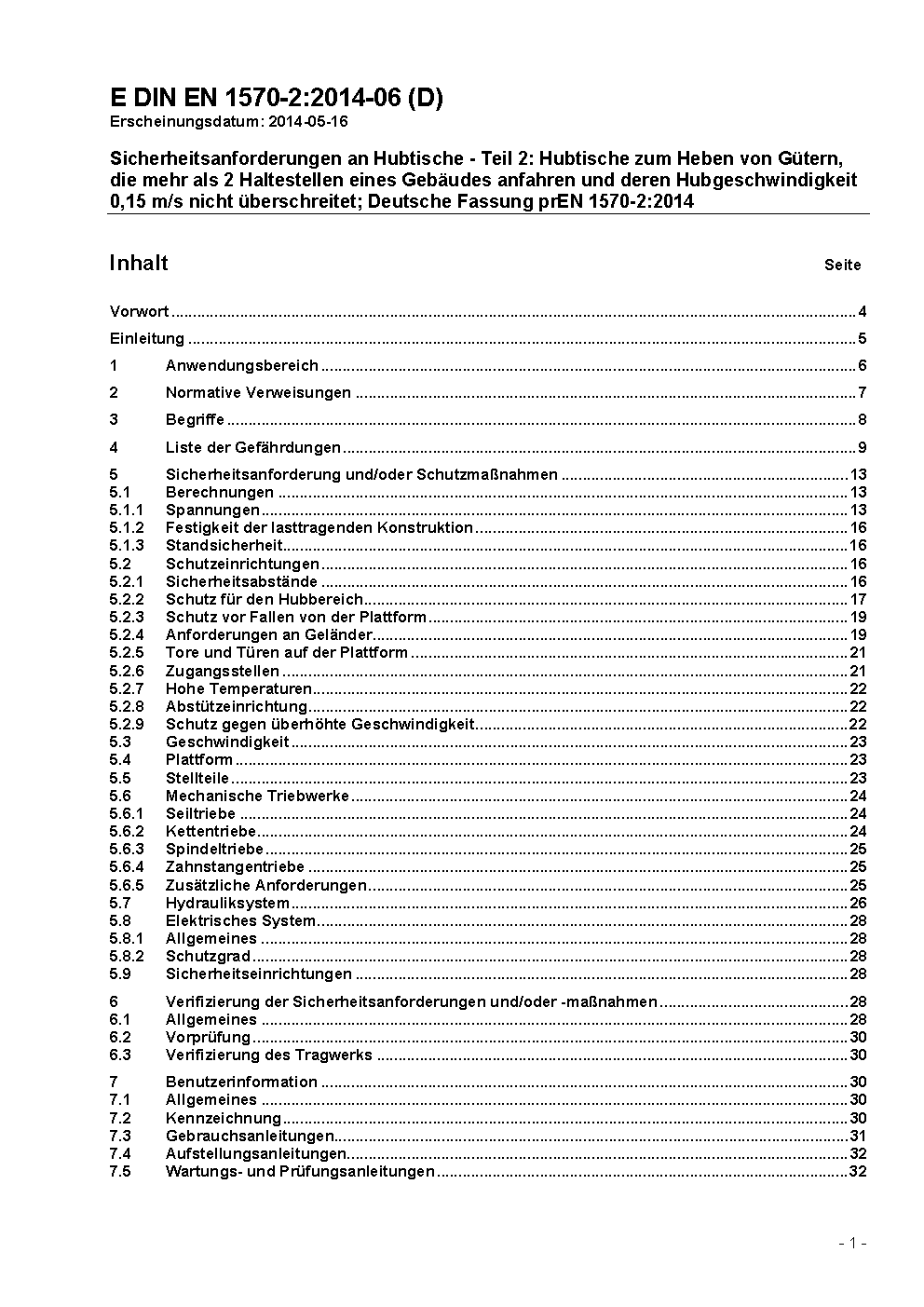Sicherheitsanforderungen an Hubtische - Teil 2: Hubtische zum Heben von Gütern, die mehr als 2 Haltestellen eines Gebäudes anfahren und deren Hubgeschwindigkeit 0,15 m/s nicht überschreitet; Deutsche Fassung prEN 1570-2:2014