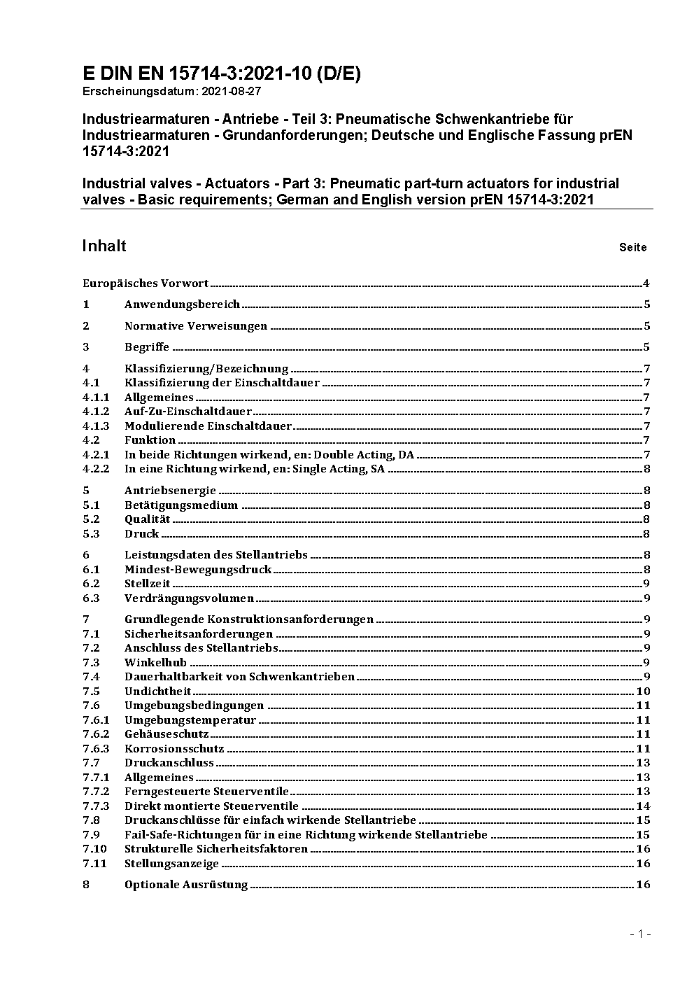 Industriearmaturen - Antriebe - Teil 3: Pneumatische Schwenkantriebe für Industriearmaturen - Grundanforderungen; Deutsche Fassung EN 15714-3:2022