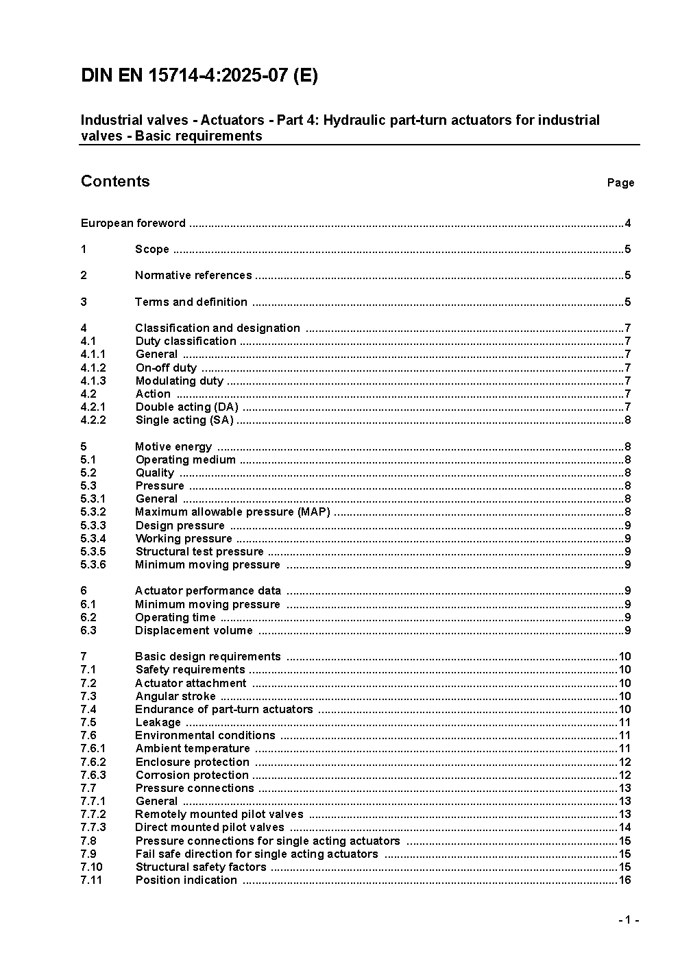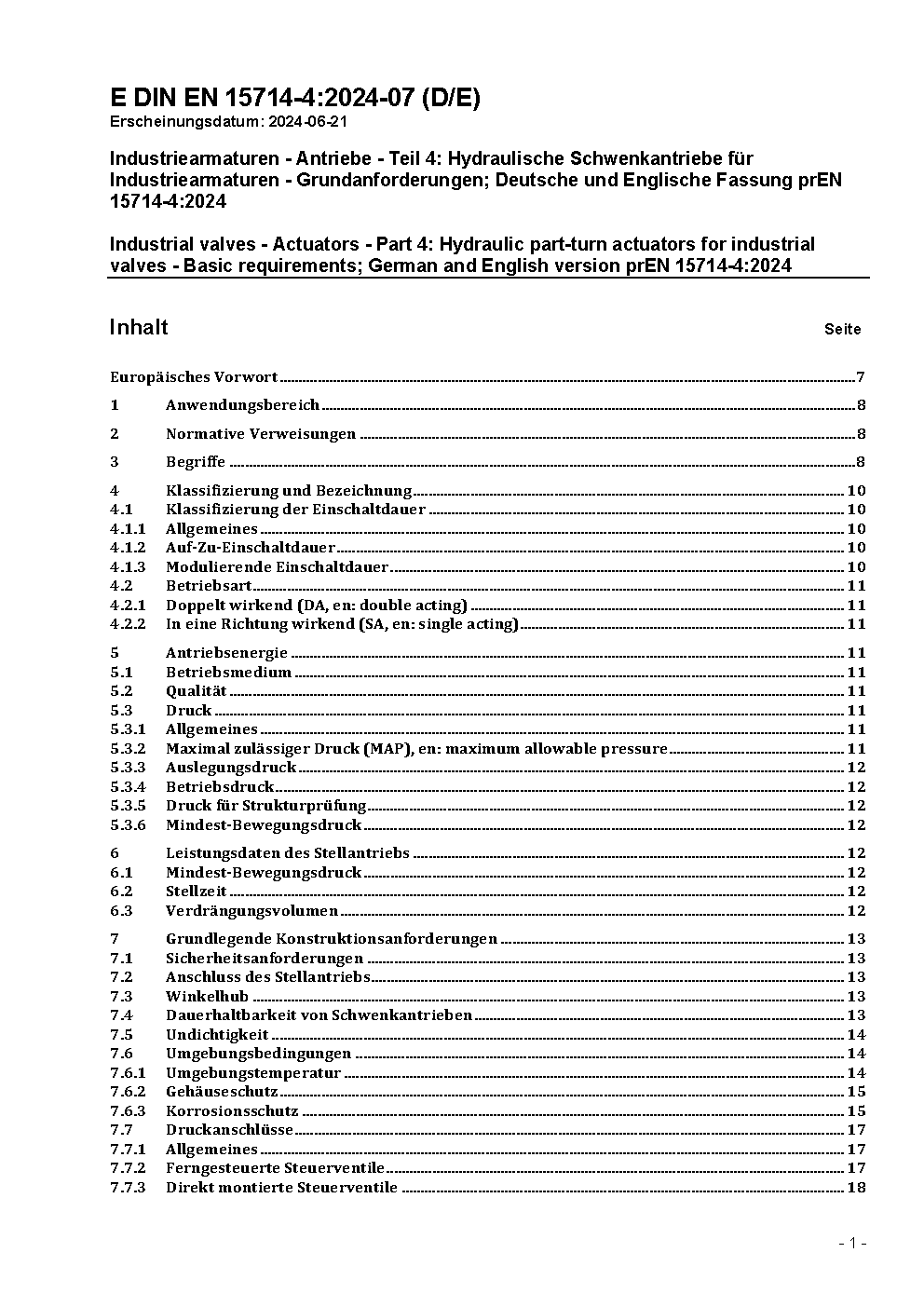 Industriearmaturen - Antriebe - Teil 4: Hydraulische Schwenkantriebe für Industriearmaturen - Grundanforderungen; Deutsche Fassung EN 15714-4:2025