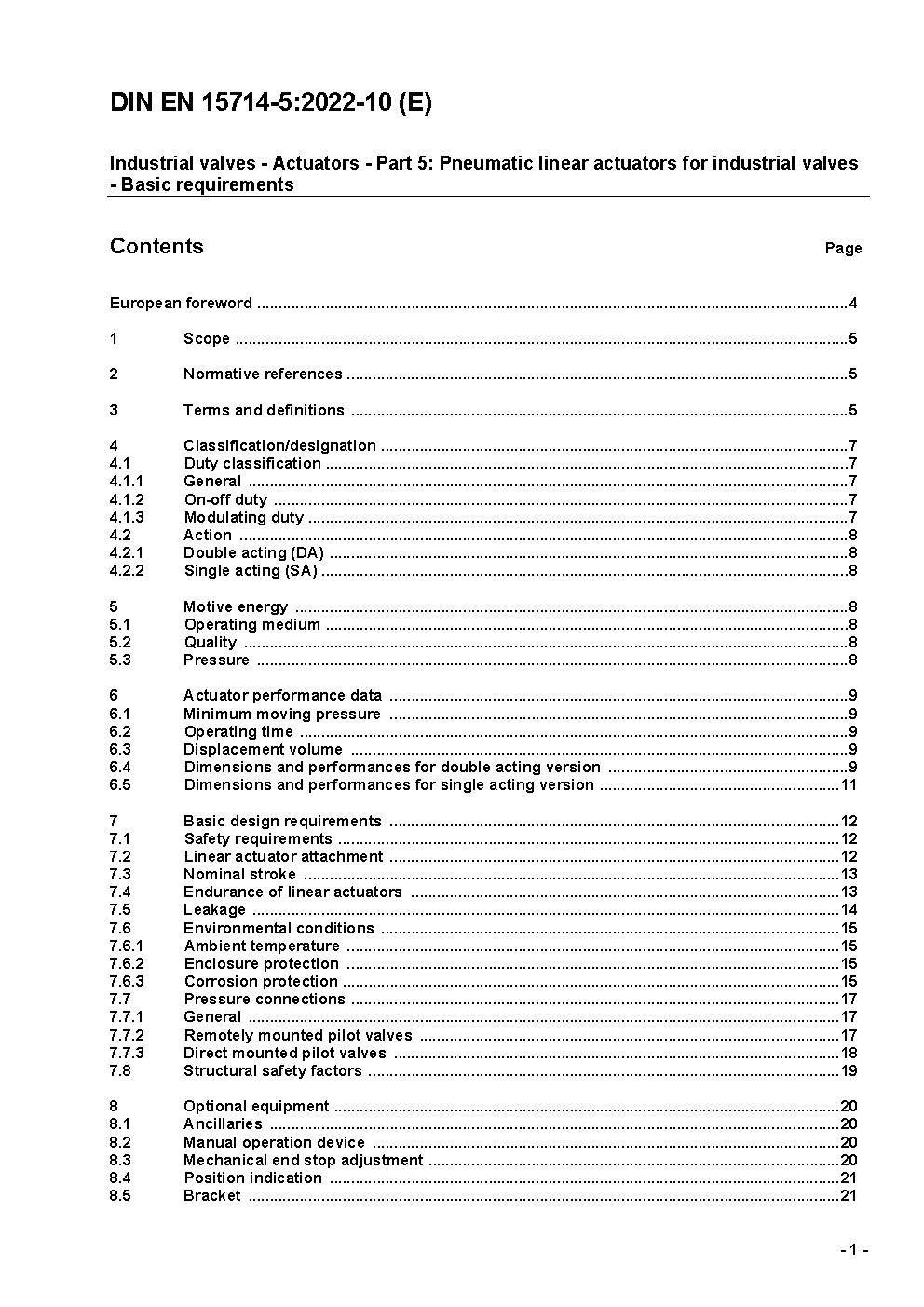 Industrial valves - Actuators - Part 5: Pneumatic linear actuators for industrial valves - Basic requirements; German and English version prEN 15714-5:2021