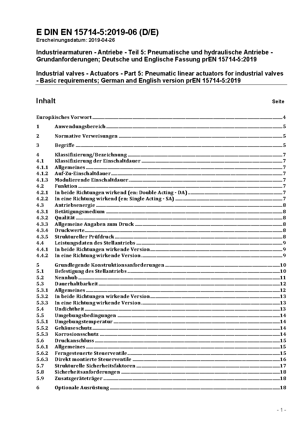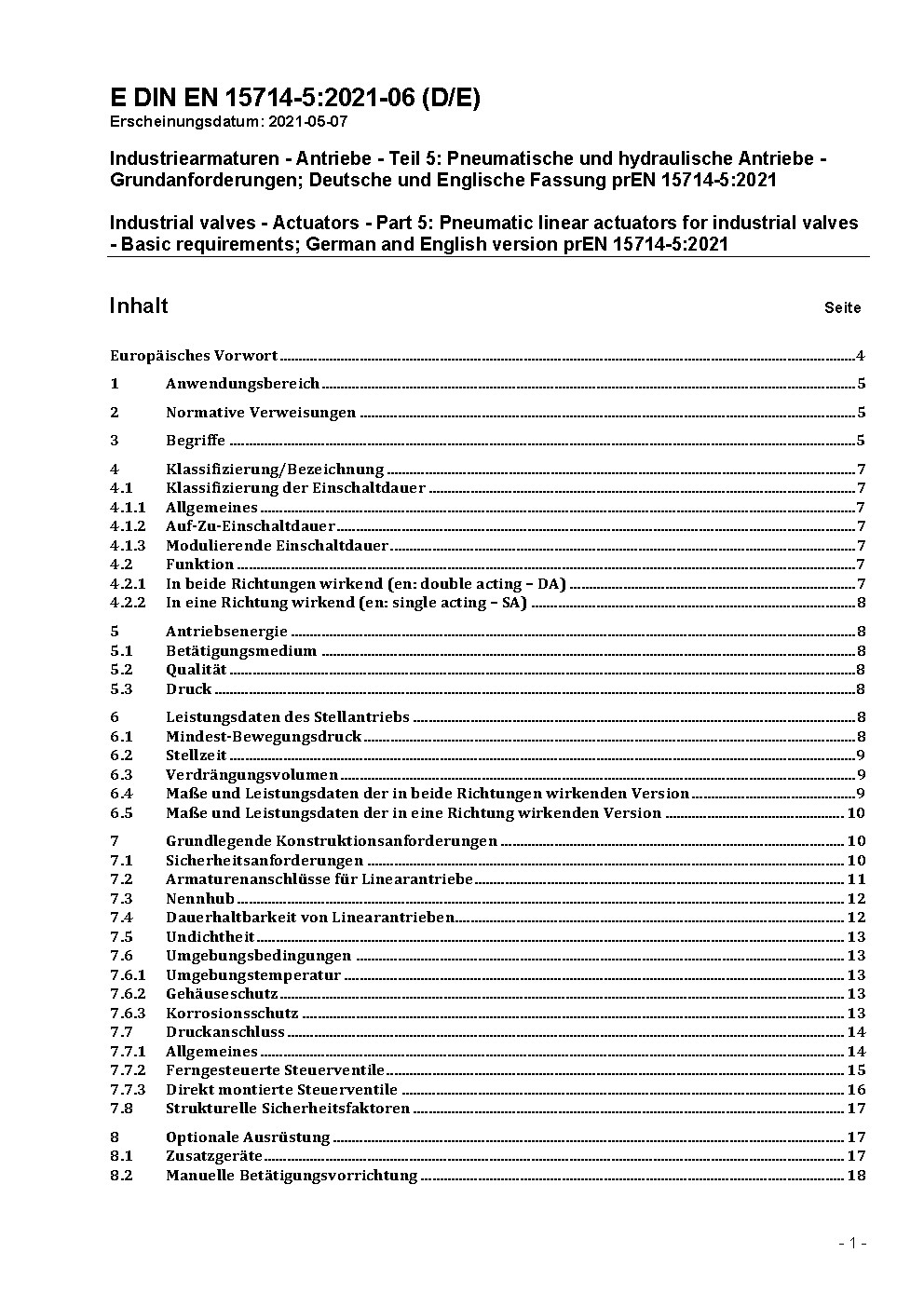 Industriearmaturen - Antriebe - Teil 5: Pneumatische und hydraulische Antriebe - Grundanforderungen; Deutsche und Englische Fassung prEN 15714-5:2021