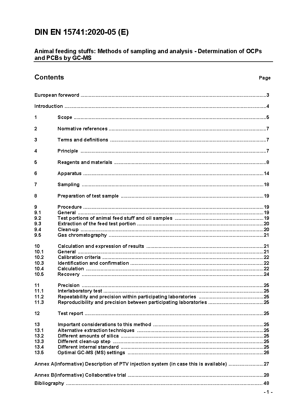 Animal feeding stuffs: Methods of sampling and analysis - Determination of OCPs and PCBs by GC/MS; German and English version prEN 15741:2018