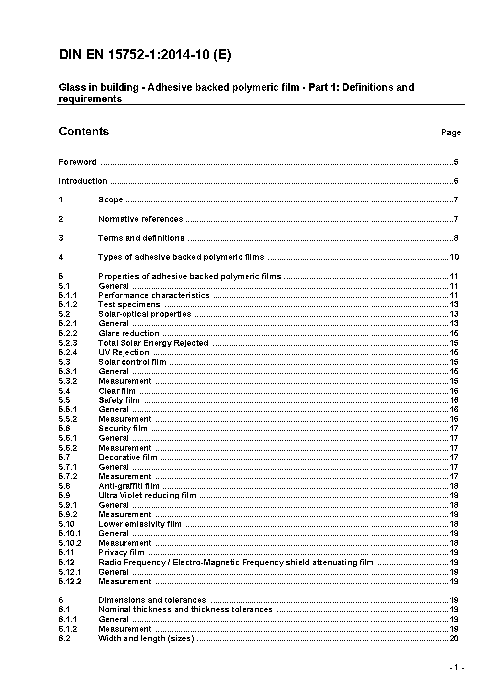 Glass in building - Adhesive backed polymeric film - Part 1: Definitions and requirements; German version FprEN 15752-1:2013