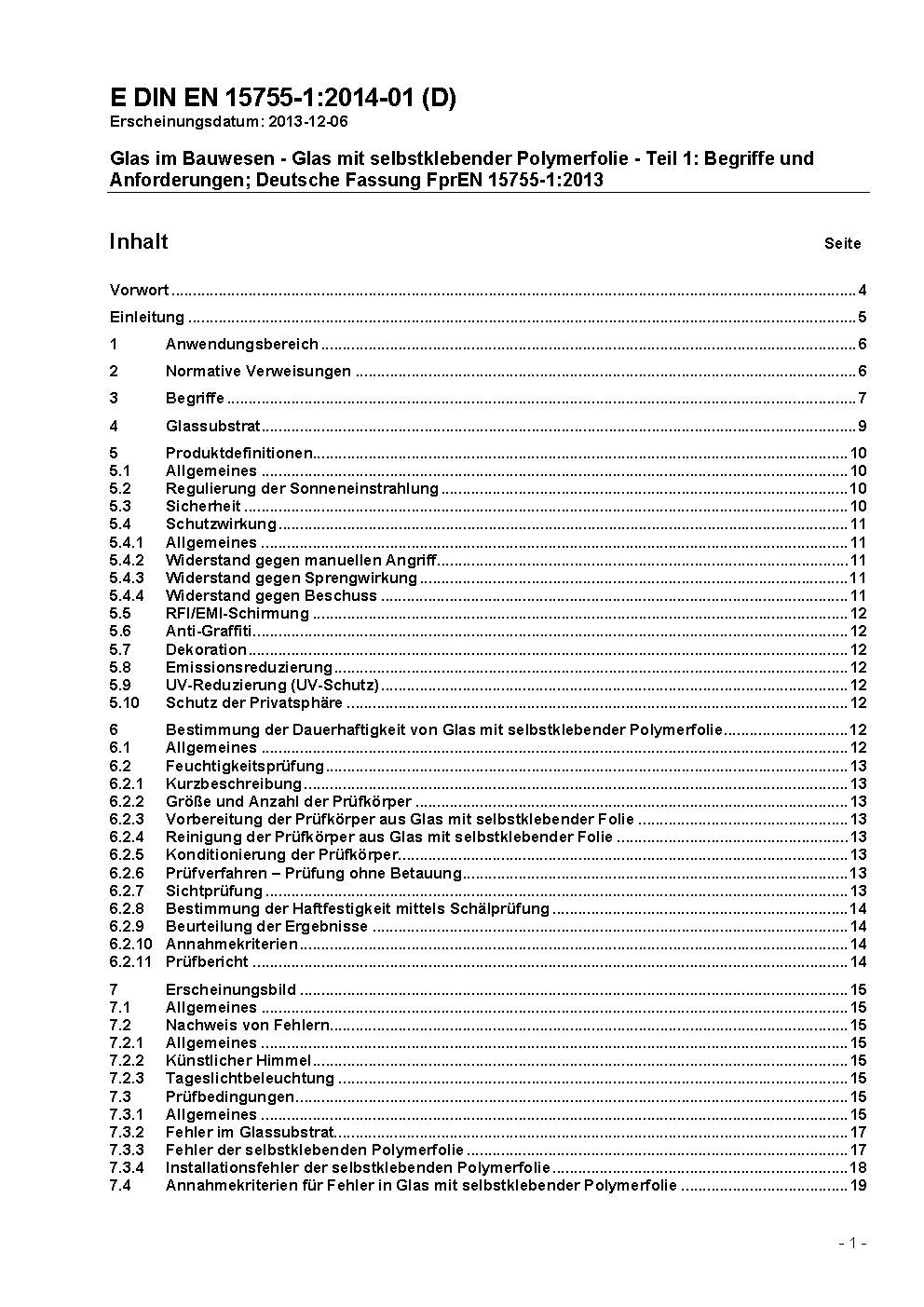 Glas im Bauwesen - Glas mit selbstklebender Polymerfolie - Teil 1: Begriffe und Anforderungen; Deutsche Fassung FprEN 15755-1:2013