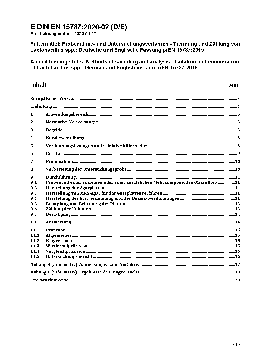 Futtermittel - Trennung und Zählung von Lactobacillus spp.; Deutsche Fassung prEN 15787:2008