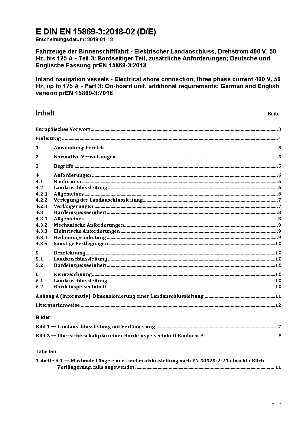 Fahrzeuge der Binnenschifffahrt - Elektrischer Landanschluss, Drehstrom 400 V, bis 63 A, 50 Hz - Teil 3: Bordseitiger Teil, sicherheitstechnische Anforderungen; Deutsche Fassung EN 15869-3:2010