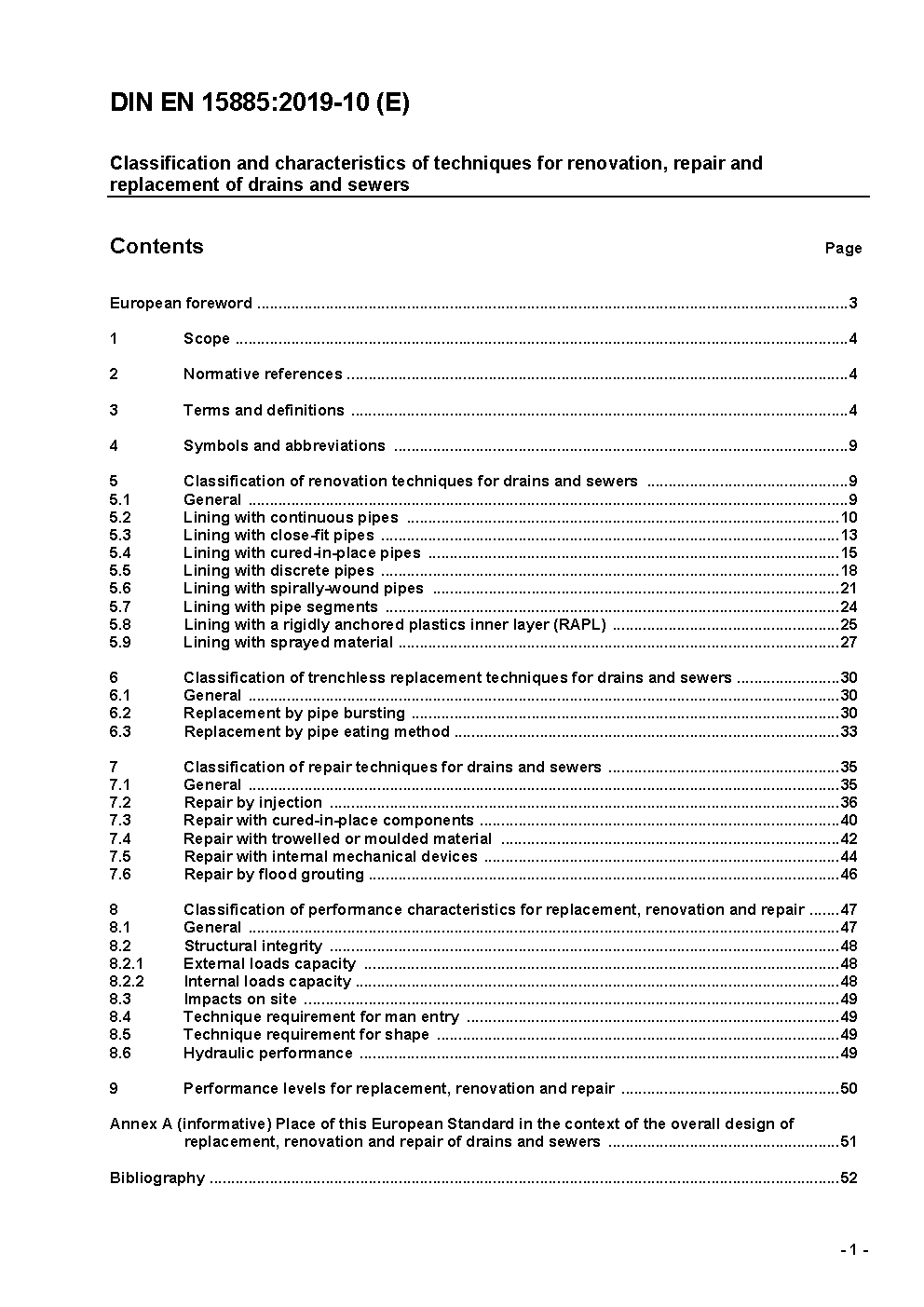 Classification and characteristics of techniques for renovation and repair of drains and sewers; German version EN 15885:2010