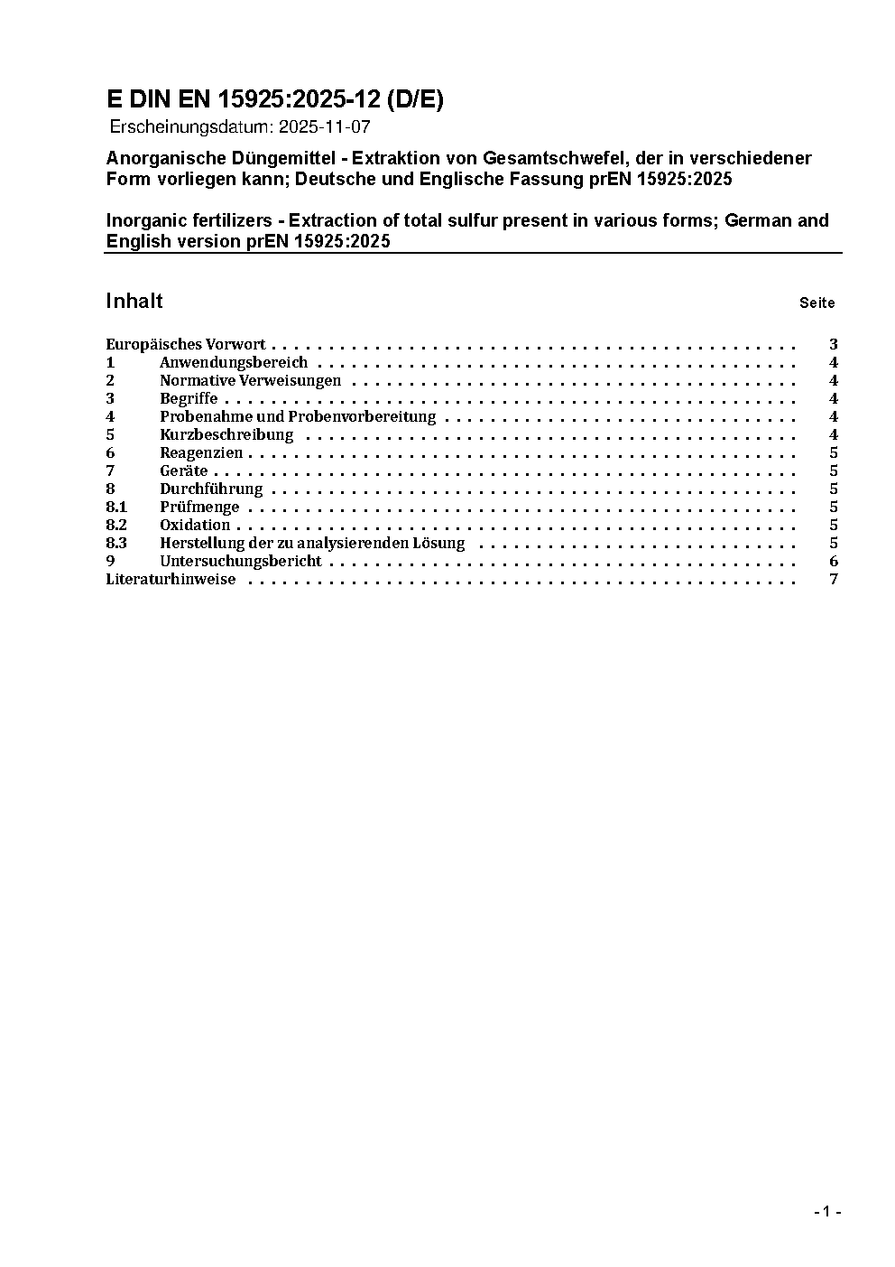 Düngemittel - Extraktion von Gesamtschwefel, der in verschiedener Form vorliegen kann; Deutsche Fassung FprEN 15925:2011
