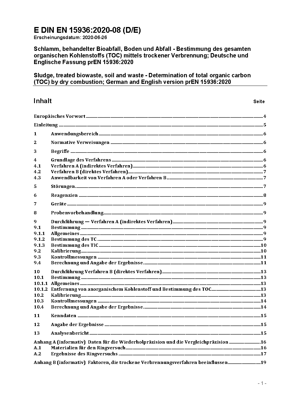 Schlamm, behandelter Bioabfall, Boden und Abfall - Bestimmung des gesamten organischen Kohlenstoffs (TOC) mittels trockener Verbrennung; Deutsche Fassung EN 15936:2012